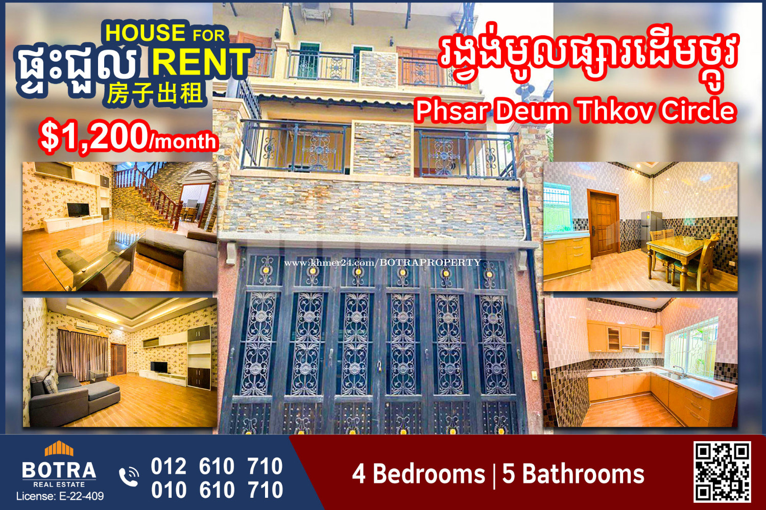 ๐ฃ House for Rent #P1334 ๐ Phsar Deum Thkov Circle - Price: $1,200/month (Nego) - 4 Bedrooms | 5 Bathrooms - Fully furnished โโโโโโโโโ Contact us now ๐ 012610xxxClick To Call (Cellcard) ๐ 010610xxxClick To Call (Smart) โถ๏ธ t.me/BotraRealEstate (Chat)
