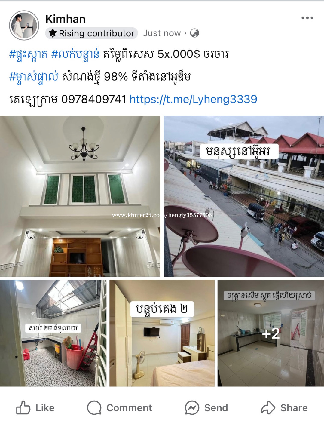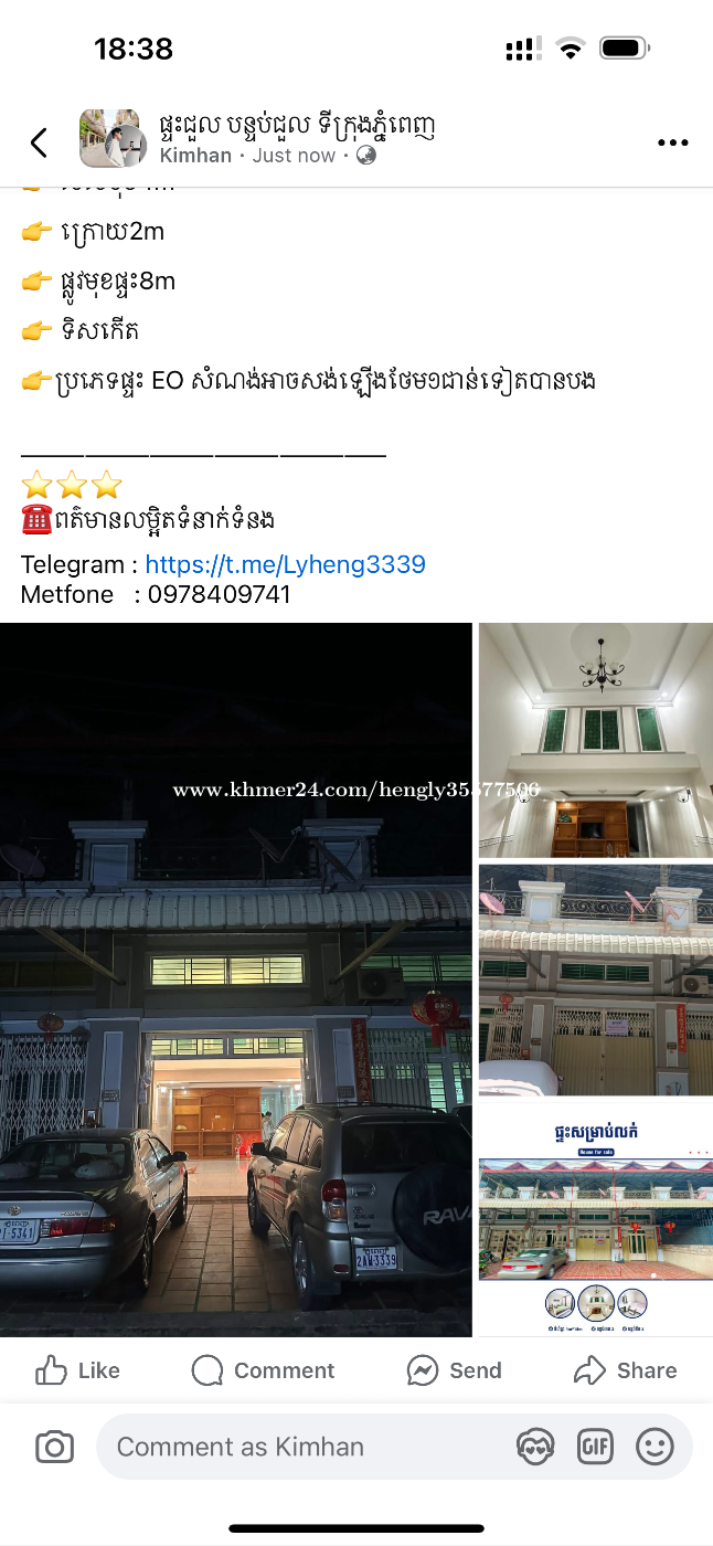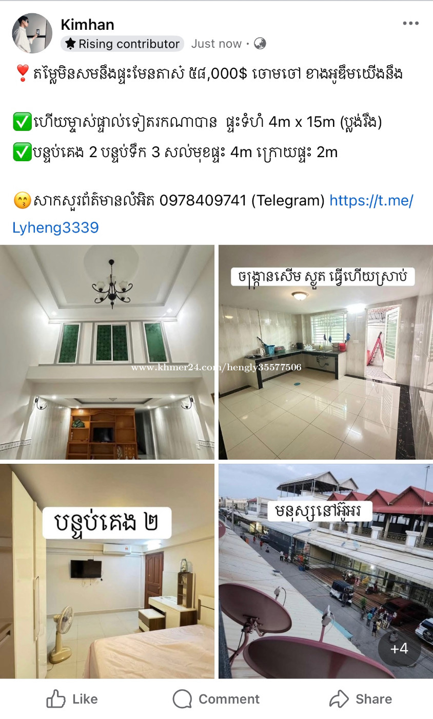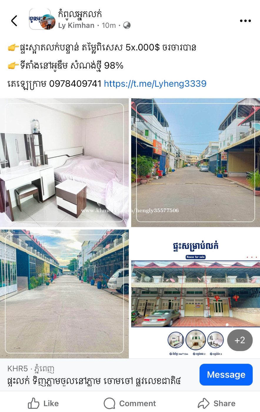 តម្លៃ 58,000$ ចរចារតិចតួច 📍 នៅចោមចៅ អូឌឹម 😘ថែមជូន ✅Free កាត់ប្លង់ ✅ម្ចាស់ផ្ទាល់ ✅មិនអស់ថ្លៃដៃ ✅ទឹកភ្លើងរដ្ឋ ✅ ចង្ក្រានបាយ សើម នឹង ស្ងួត (ធ្វើហើយស្រាប់) ✅ ទូតាំង ចំនួន1 ✅ ម៉ាស៊ីនត្រជាក់ ចំនួន2 ————————————————— 👉ប្លង់រឹង 100% (មិនជាប់ធនាគារ) 👉 ទំហំផ្ទះ 4m x 15m 👉 ទំហំដី 4m x 21m 👉 2បន្ទប់គេង 👉 3បន្ទប់ទឹក 👉 សល់មុខ4m 👉 ក្រោយ2m 👉 ផ្លូវមុខផ្ទះ8m 👉 ទិសកើត 👉ប្រភេទផ្ទះ EO សំណង់អាចសង់ឡើងថែម១ជាន់ទៀតបានបង ————————————————— ⭐️⭐️⭐️ ☎️ពត៌មានលម្អិតទំនាក់ទំនង Telegram : https://t.me/Lyheng3339 Metfone : 0978409xxxClick To Call