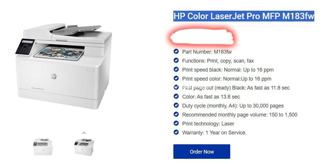 HP Color Laser Jet Pro MFP M183fw Functions: Print, Copy, Scan, Fax Print speed black: Normal Up to 16ppm Print speed color: Normal Up to 16ppm First page out (ready) Black: As fast as 11.8sec Color: As fast 13.8sec Duty cycle (monthly,A4) Up to 30000 pages Recommended monthly page volume: 150 to 1500 Print technology: Laser តម្លៃ : 230$ ចរចាបានទៀត