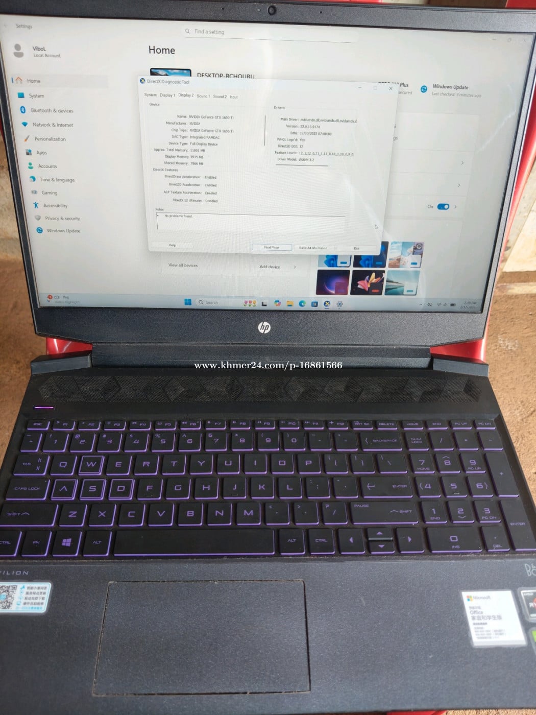 CPU: AMD Ryzen 7 4800H with Radeon Graphics 512MB GPU: NVIDIA GeForce GTX 1650Ti 4GB RAM: 16GB DDR4 SSD: 128GB HDD: 1TB Battery: 3H-4H WINDOWS 11 Free Mouse Charger and Bag Laptop ដើរលឿនខ្ញុំប្រើរាល់ថ្ងៃមិនដែលមានបញ្ហាអ្វីទេ ចង់យកលេងហ្គេមក៏បានយកទៅកាត់តក៏បាន
