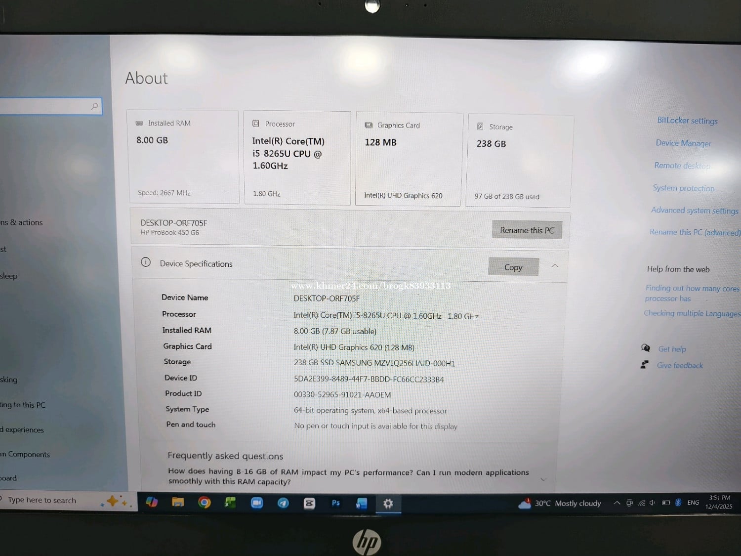 HP ProBook 450 G6 - Core i5 8265U /1.6 GHz - Win10 Pro 64-bit - 8 GB RAM - 256 GB SSD NVMe -15.6" IPS 1920 ×1080 (Full HD) - UHD Graphics 620 - Wi-Fi, Bluetooth ✅យកទៅរៀន ធ្វើឯកសារ កាត់តវីដេអូ កាត់រូបភាពបានម៉ាអែម អត់ទាក់ អេក្រងច្បាស់់ធំល្អ ✅ថ្មនៅកាន់ល្អ តួស្អាត laptop ដំណើរការទាំងអស់