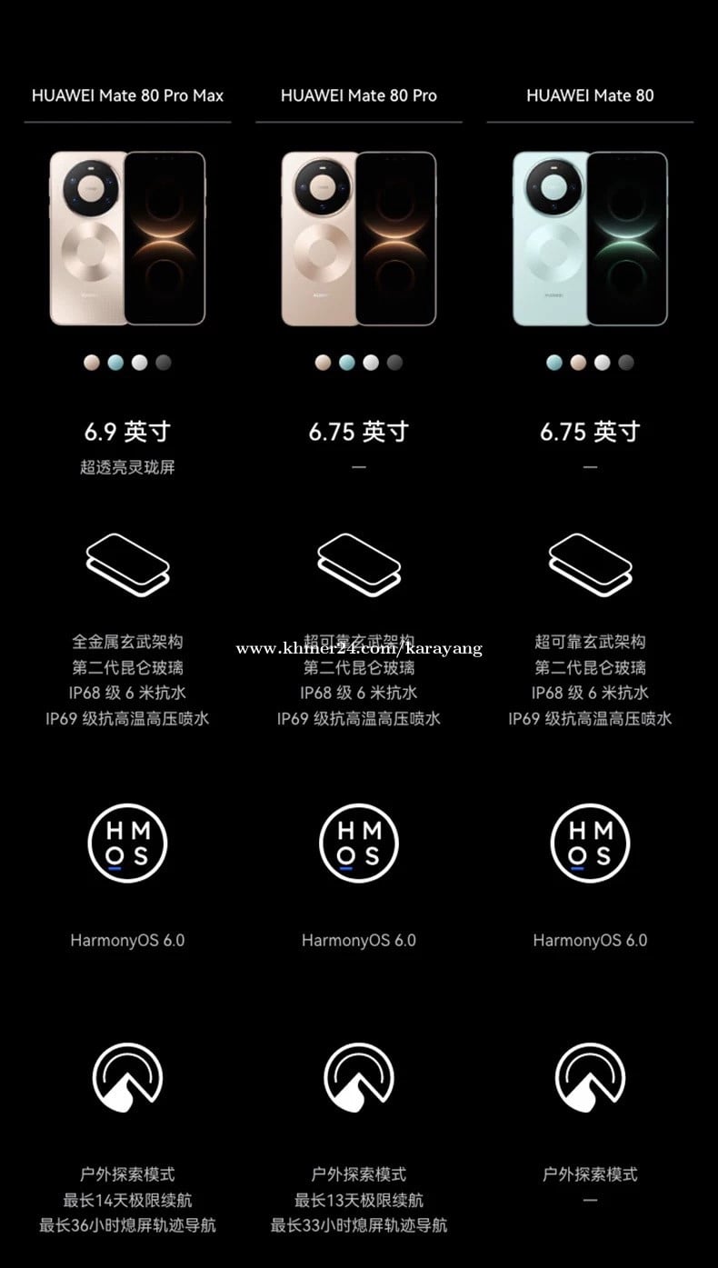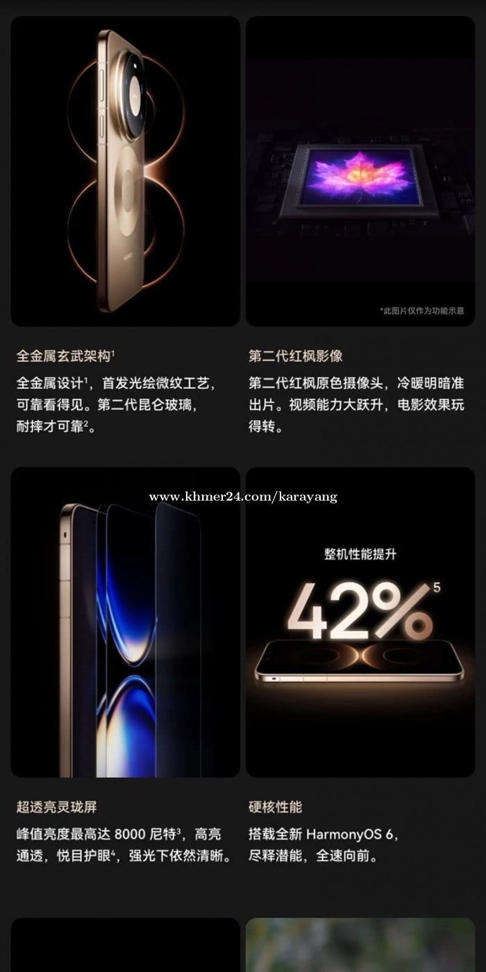 Accessories: Original full set, 1pcs screen protector, 1pcs case. Phone version: CN SIM2. Phone condition: 100% new original. CPU: Kirin 9030 Pro. Battery: 6000mAh. Charging peak power: 100W+80W wireless charging, support reverse charging. Screen size: 6.9inch. Screen refresh rate: 120Hz. Main screen material: LTPO OLED. Screen type: full screen. On market: September, 2025. Rear cameras: 50MP+40MP+50MP+50MP. Front camera: 13MP+3D ToF. Operation system: HarmonyOS 6.0 IP grade: IP68+IP69. PhonoX Smart Tech. Smarter Price. New | Used | Accessories | Trade-In 📍 Chaom Chau, Phnom Penh. 📞 +85586587xxxClick To Call(Telegram) Telegram: @karayang1991 Join Telegram channel: https://t.me/+qJxqHs0n5BdlZDE1 https://www.tiktok.com/@kara.yang39?_t=ZS-8xr7fEJ8ArQ&_r=1 Address: Phnom Penh, Dangkao District, Krang Pongro, Krang Svay.