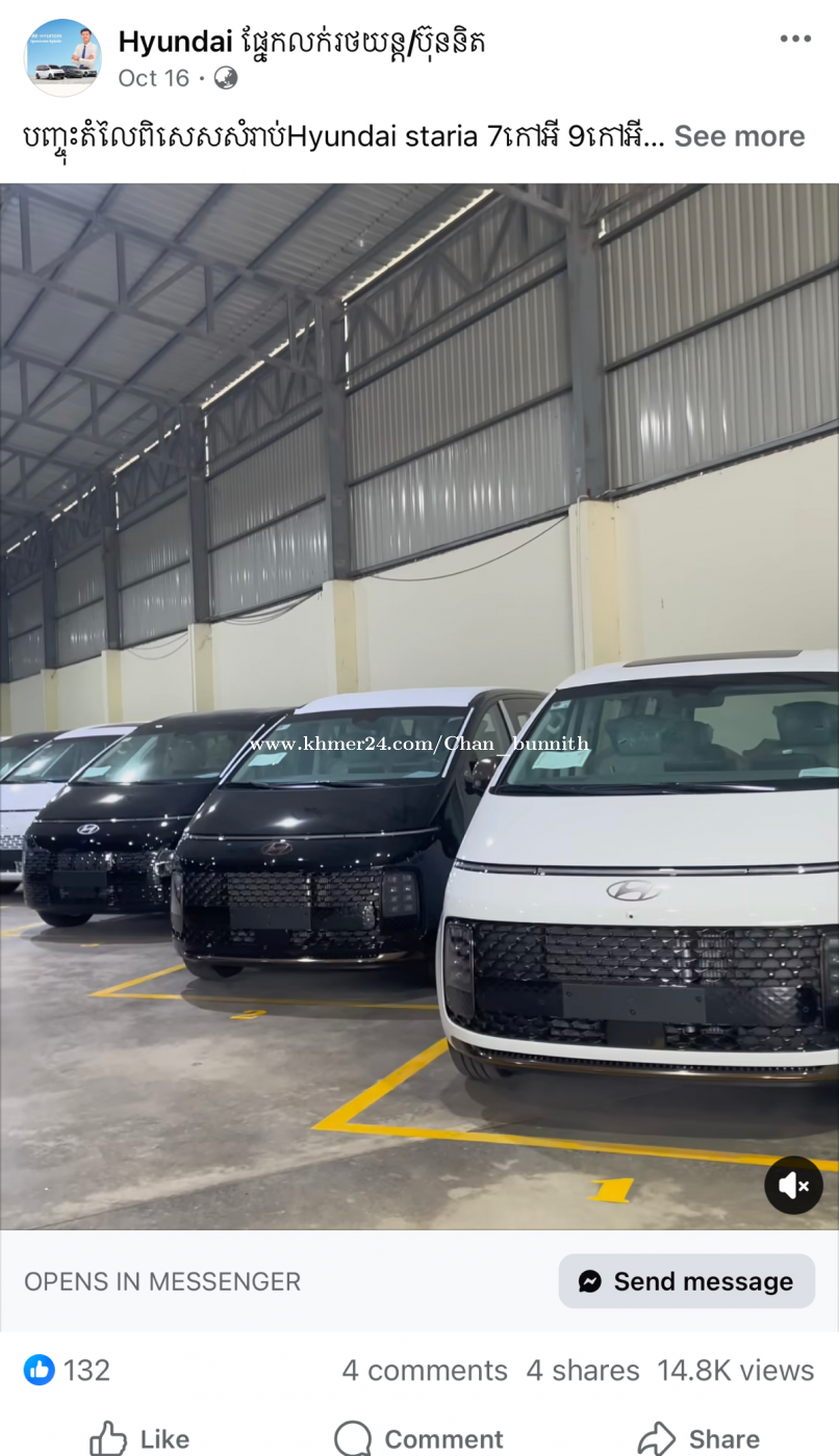 ផ្តល់ជូនជម្រើសពណ៌ខាងក្នុងរហូតដល់បីពណ៌សំរាប់ Hyundai STARIA VIP Lounge! 👉ផ្តល់ជូនតំលៃពិសេស 60,490$ 👉🏻Special price only 60,490$ • ថែមកម្រាលជើង (Luxury Floor Mat) • ថែមស្លាកលេខវែងធម្មតា (Normal long Plate Number) • ធានា5ឆ្នាំ ឬ ១០០.០០០គម (Warranty 5 Years or 100.000km) • ប្តូរប្រេងម៉ាស៊ីនជូន6ដង (6 Times Engine Oil) 📞ទំនាក់ទំនងផ្នែកលក់ ប៊ុននិត៖ 0889669xxxClick To Call/0969889xxxClick To Call 📲តេលេក្រាម: https://t.me/Bunnith_Sale