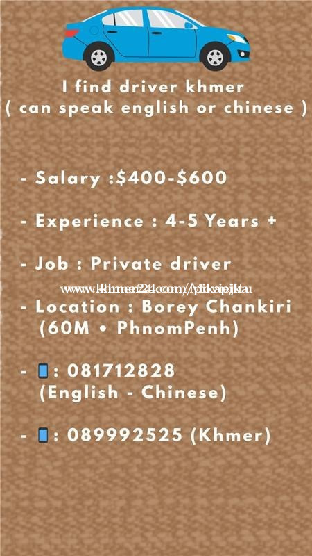 I find driver khmer ( can speak english or chinese ) Salary :$400-$600 Experience : 4-5 Years + Job : Private driver Location : Borey Chankiri ( 60M β’ PhnomPenh ) π±: 081712xxxClick To Call ( English - Chinese )