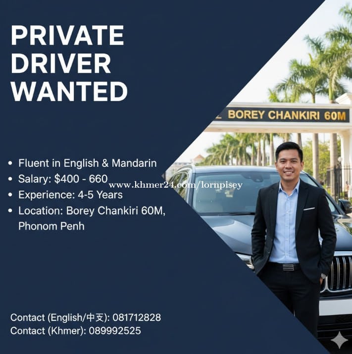 Looking for a private driver who can speak in English and Mandarin. Salary: $400 - $600 Experience: 4-5 years Job: Private Driver Location: Borey Chankiri 60M, Phnom Penh Interested applicants can contact: English or Chinese: 081712xxxClick To Call Khmer: 089992xxxClick To Call