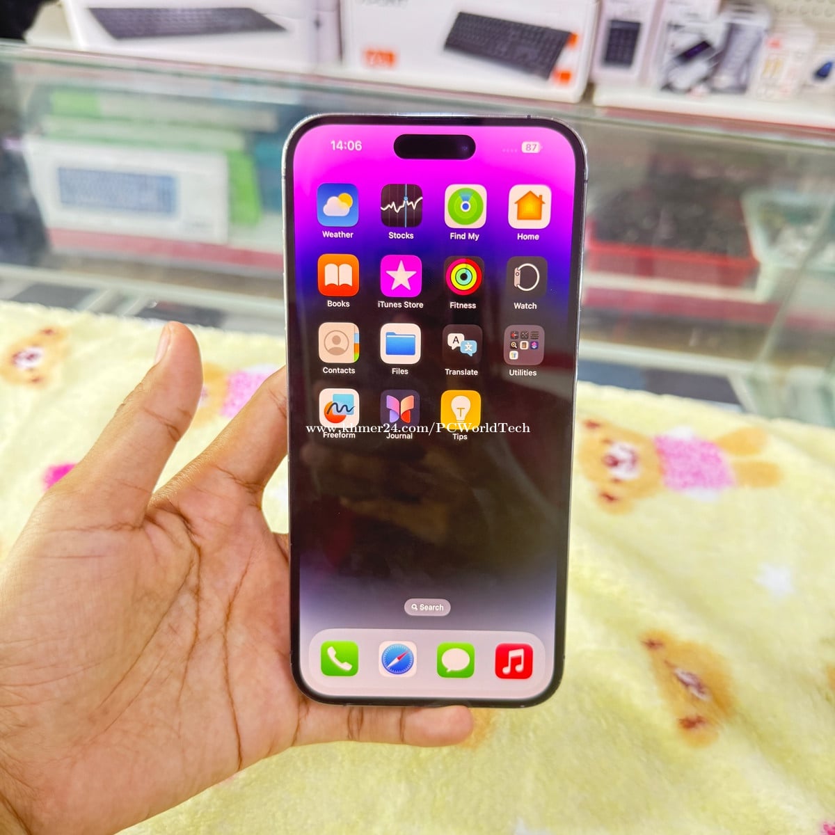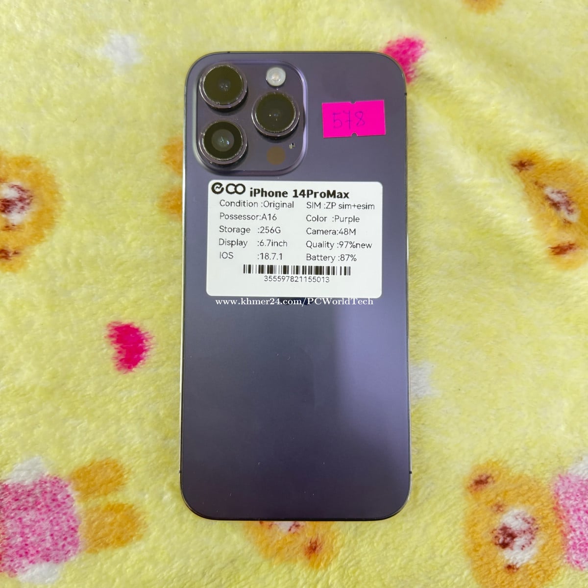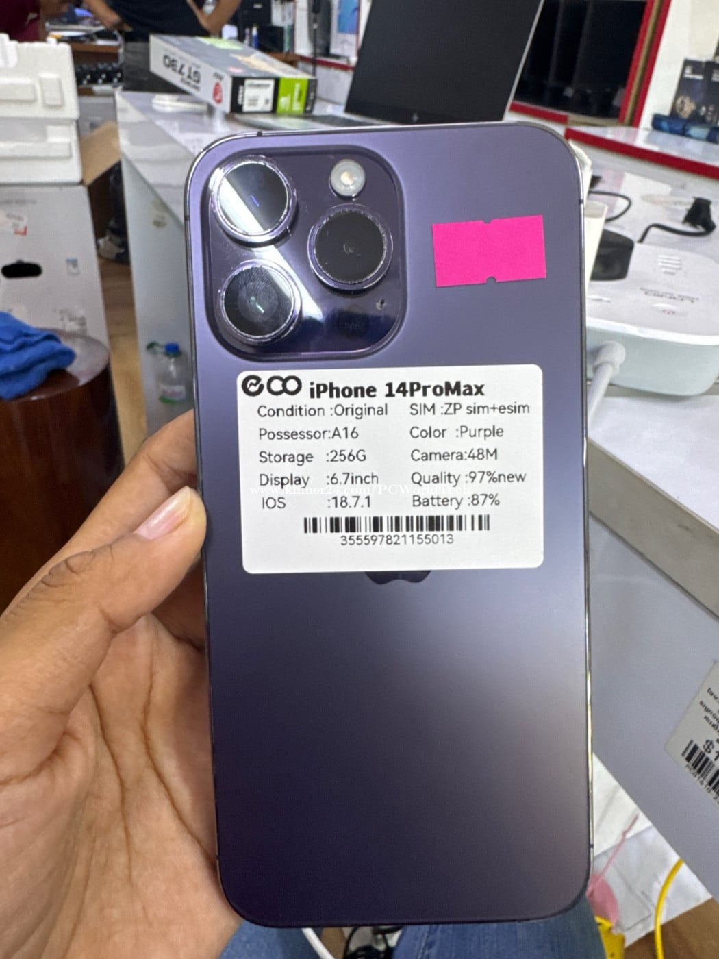I Phone 14 ProMax Original Screen Storage 256G Display 6.7inch iOS 18.7.1 Sim ZP sim +esim Color Purple Camera 48M Battery 87% Quality 85%