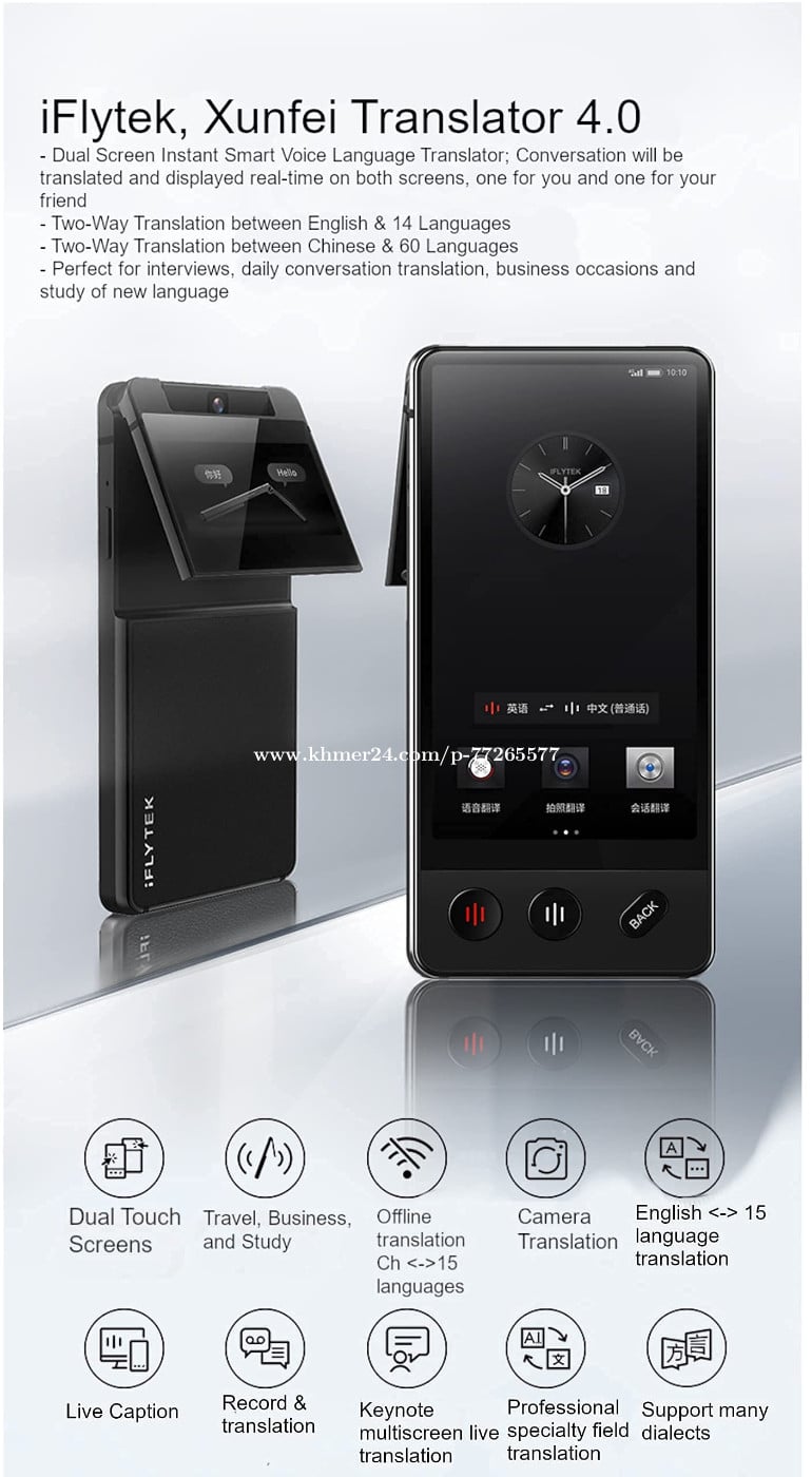 ម៉ាស៊ីនបងប្រែភាសា iflytek translator 4.0 dual screen - នៅថ្មីប្រអប់ - Dual Screen Instant Smart Voice Language Translator,Two-Way Translation of English 14 Languages,Chinese 60 Languages for Travel,Business and Study.Offline Translation,black Telegram: 077265xxxClick To Call / 0978999xxxClick To Call
