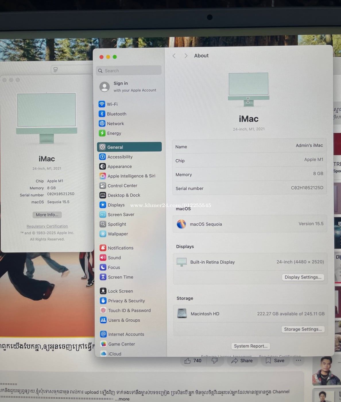 iMac 2021 M1, 8gb, 256gb finger scan keyboard, blue full set នៅស្អាត Tel: 012255xxxClick To Call Telegram: 012255xxxClick To Call