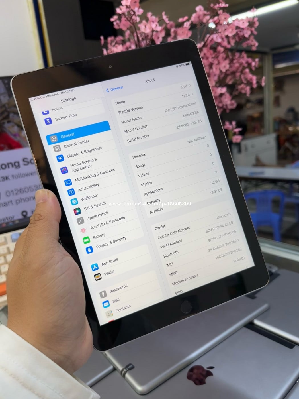 iPad 6 generation 32G មួយទឹកស្អាត ស្រុកក្រៅ Sim+wifi version 17.6.1 (2018) Free case +screen តម្លៃ 88$ Call:015605xxxClick To Call☎️/:012605xxxClick To Call☎️ Telegram:https://t.me/HENG_CHENDA15 ធានាជូន: 7ថ្ងៃលើការប្រើប្រាស់😊 📍ទីតាំង : ទល់មុខម៉ុងឌីយ៉ាល់ចាស់ ផ្សារមនោរម្យអេឡិចត្រូនិចច្រកទី1 🗺️ map: https://maps.app.goo.gl/dqWtB3W7RVjLHUeN8?g_st=ic FB Page : https://www.facebook.com/share/1D4enYniS9/?mibextid=wwXIfr «ទិញដាច់ វៃដូរ សេរី បានបងបង»