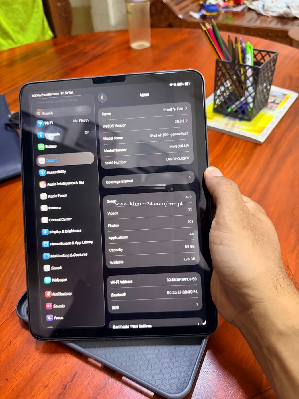 iPad air 5th, CPU M1 64G Wifi only ស្អាត 99%, សំនុំហ្ស៊ីន មិនដែលជួសជុល មានឆ្នាំងសាក ខ្សែសាក និងប្រអប់