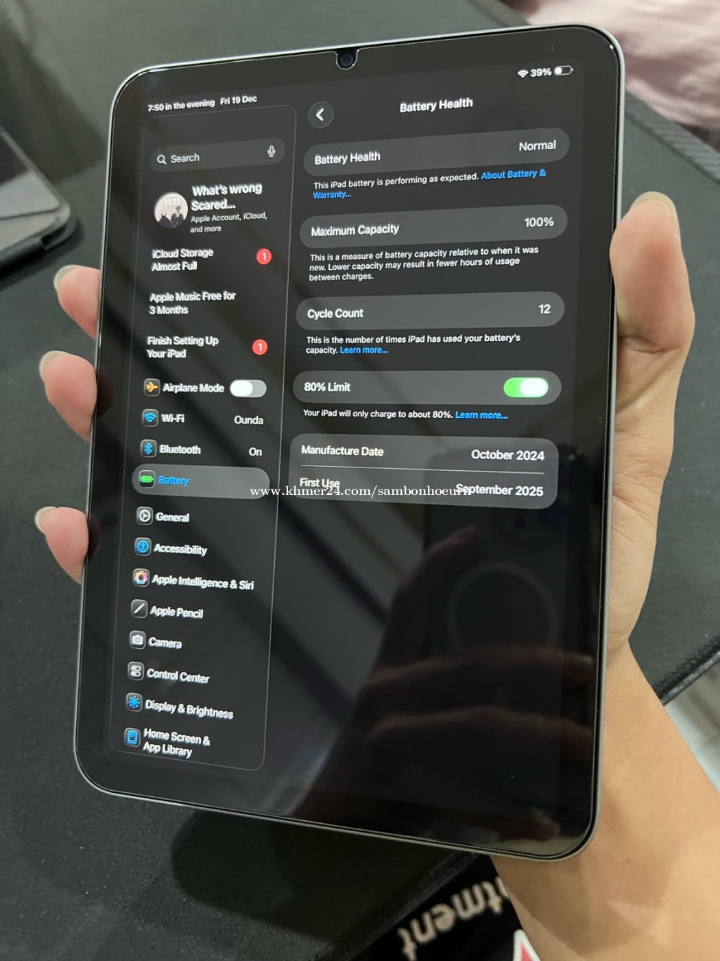 iPad mini7 LL/A 256G WIFI មានប្រអប់និងគ្មានស្នាមឆ្កូត របស់ប្រើផ្ទាល់សាកថ្មបាន13ដង