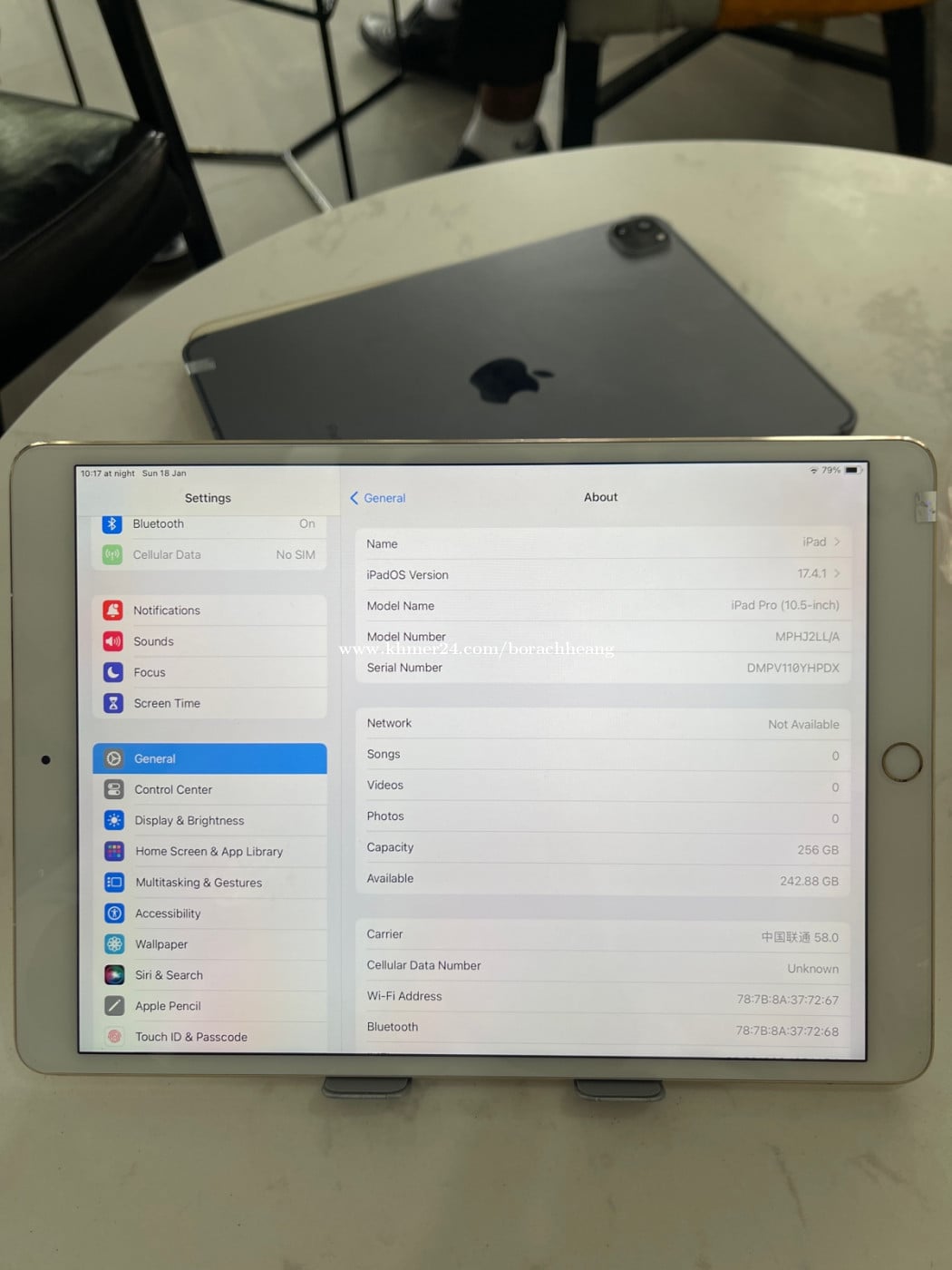 iPad Pro 2017 LLA (10.5) - Sim&Wifi - Storage 256g - Battery Health 87% - Cycle Count 234 - Condition Body 98% - Software 17.4.2 - Free case, Charger and Screen - Price 170$ Location Phnom Penh Contact 087497xxxClick To Call