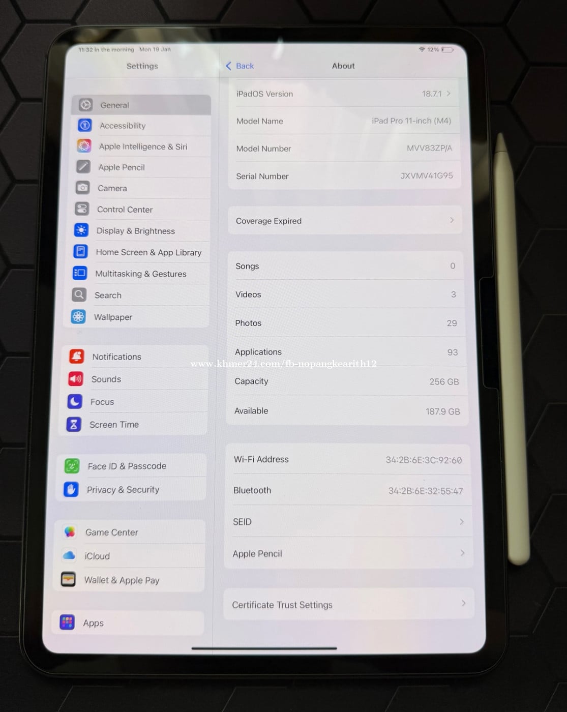 • iPad Pro M4 256GB (Wi-Fi) – Dark Gray • Condition: 99% new, no scratches or damage • Battery health normal (only 69 cycles) • No Charging Cable • Comes with Apple Pencil Pro • Includes Skinarma case