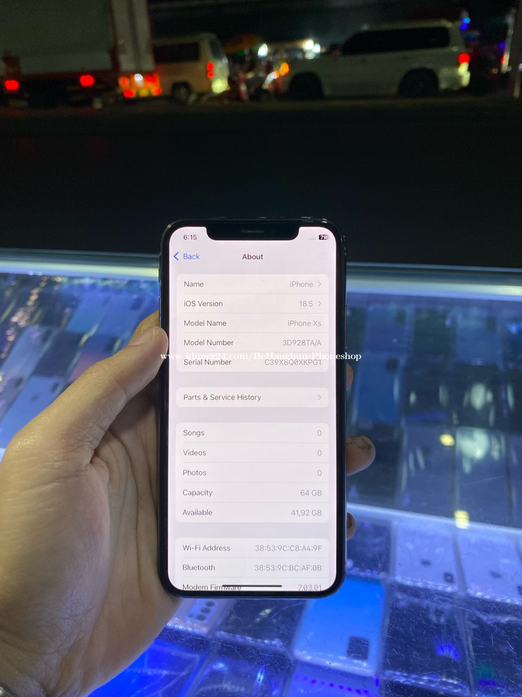 iPhone Xs 64G មួយទឹកស្អាត98.99% មានស្កេន ធានាម៉ាសុីនហ្សុីន អេក្រង់ហ្សុីន នឹងធានាការប្រេីប្រាស់រយៈពេល15ថ្ងៃ មានឆ្នាំងសាក មានបងរំលស់ជាមួយហាង មានសេវ៉ាដឹកជញ្ជូន25ខេត្ត-ក្រុង ទីតាំង : ជិតស្តុបលូប្រាំ ស្ទឹងមានជ័យ Tel : 099777xxxClick To Call / 081336xxxClick To Call / 0972312xxxClick To Call
