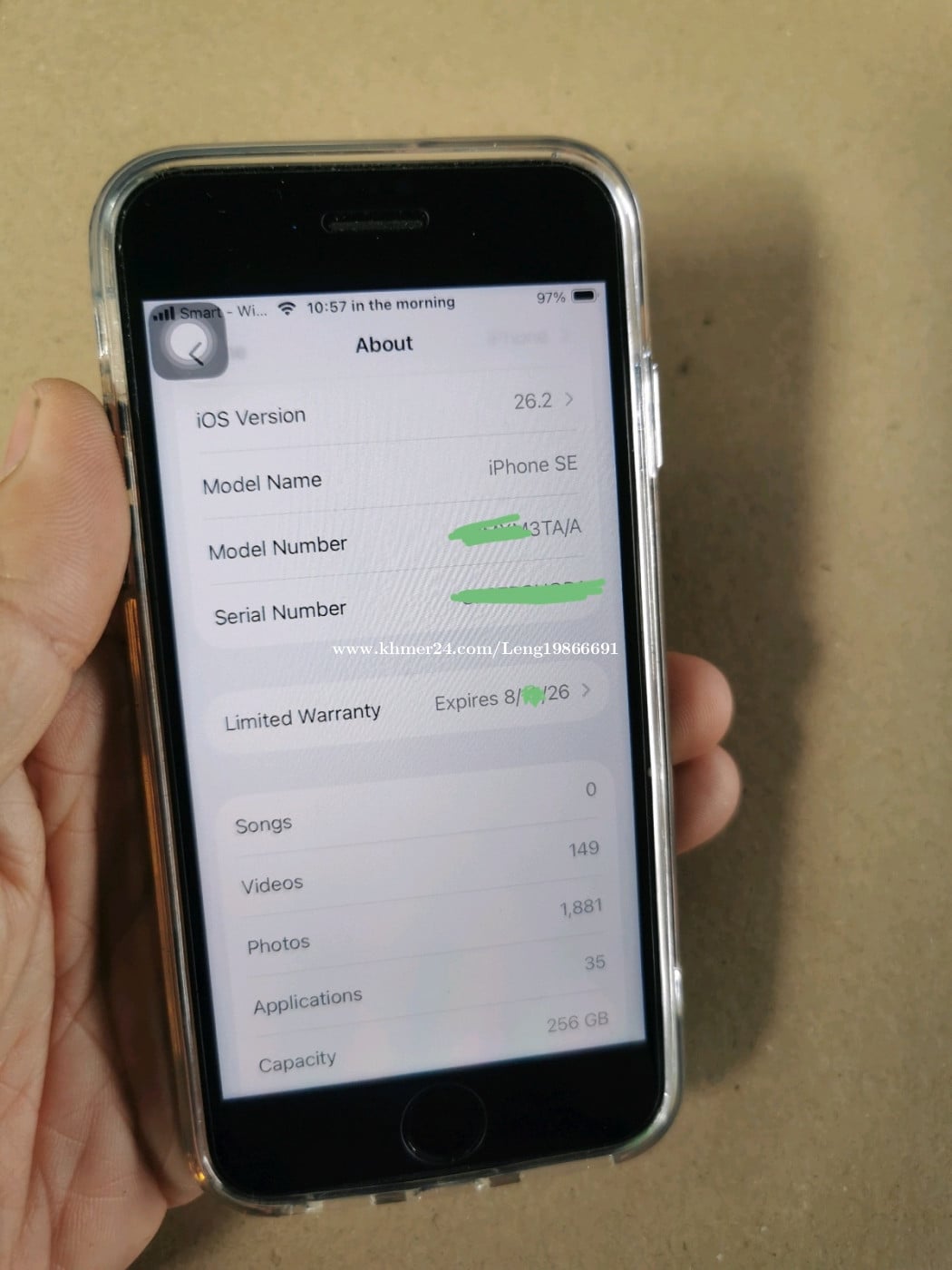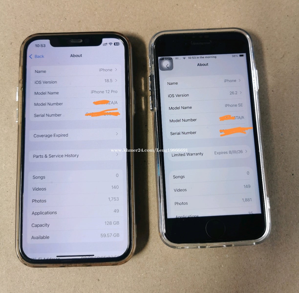 *ទូរស័ព្ទនៅសំណុំណែន មិនដែរដោះ -IPhone 12 Pro : ZA/A 128GB ថ្ម72% ដាក់ Sim2 =តំលៃ180$ (ខូច Speaker ខាងលើ ពេលខ្លះអត់ឮ) តំលៃ185$ ដាច់ -IPhone se3 : TA/A 256GB ថ្ម100% Sim1 +Esim (នៅថ្មីខ្ចី នៅធានាពីApple ) តំលៃ175$ ដាច់ ( ត្រូវការលក់ចេញមួយ ទុកមួយប្រើ ) (ខ្ញុំជាប់ធ្វើការ អាចមកមើលបាននៅពេលល្ងាច)