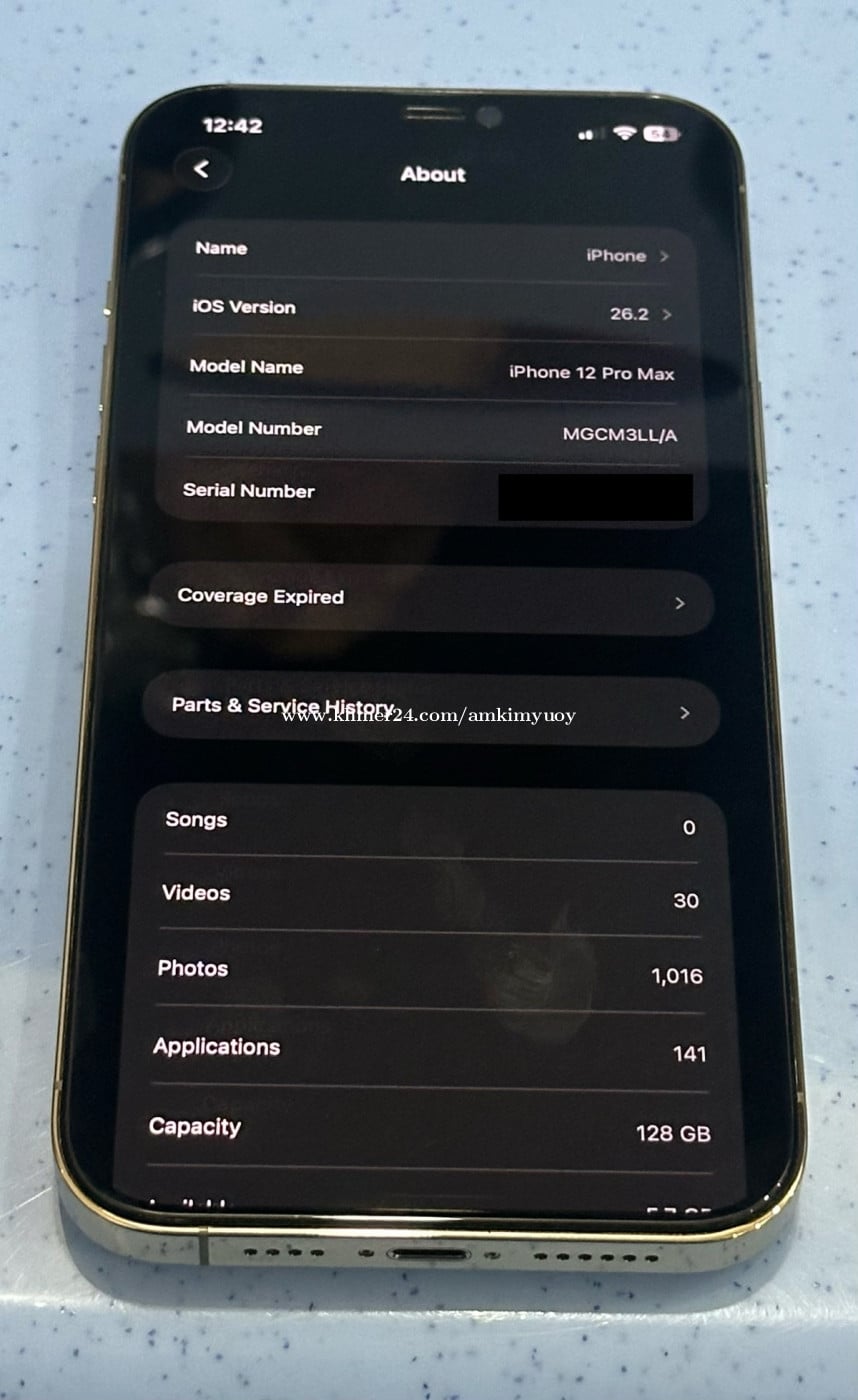 iPhone 12 Pro Max Color: Gold Storage: 128GB មានខ្សែសាក និងឆ្នាំងសាក