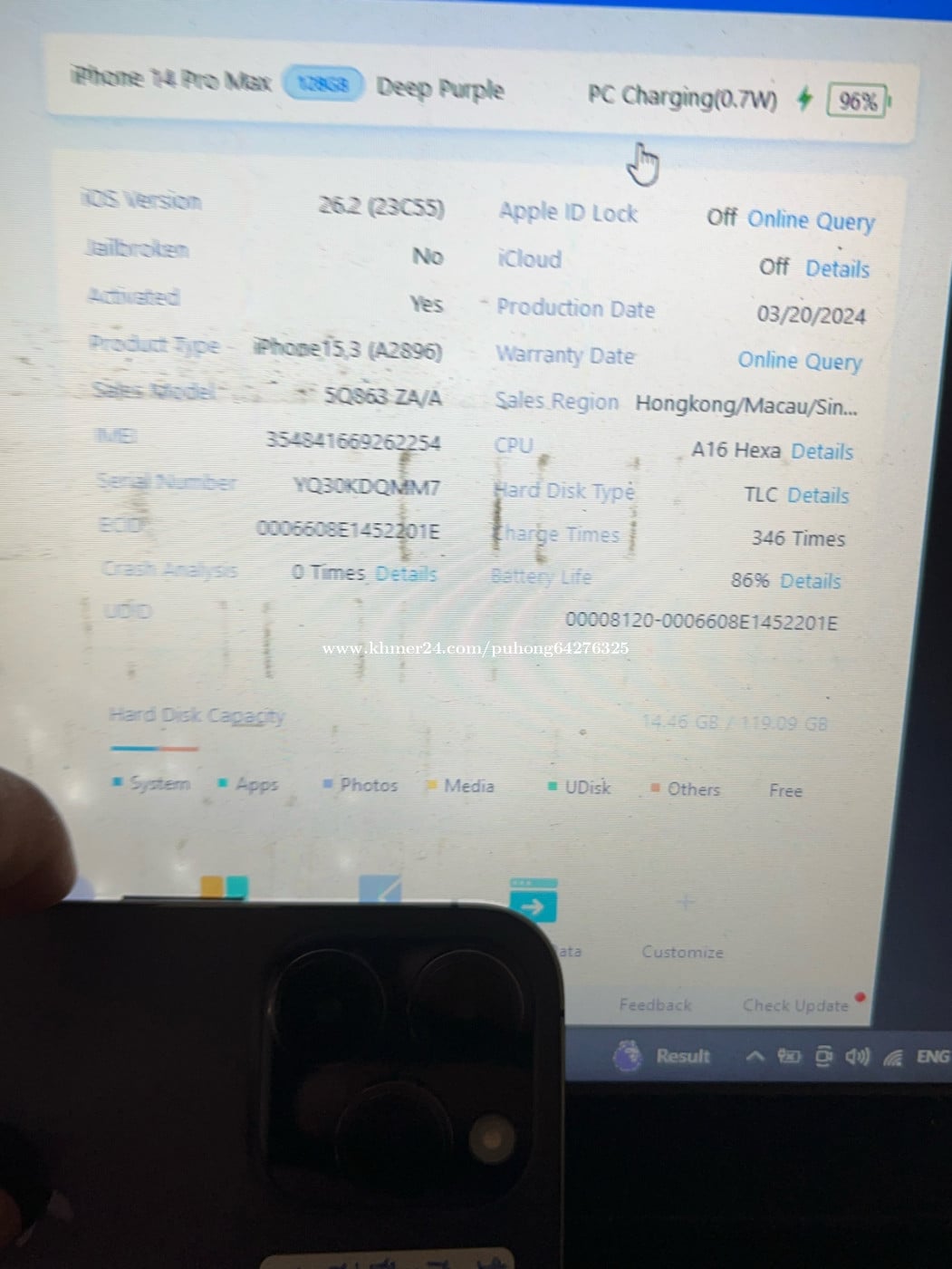 iphone 14 PM 128G សានុំណែន ថ្មសុីន 85% 515$