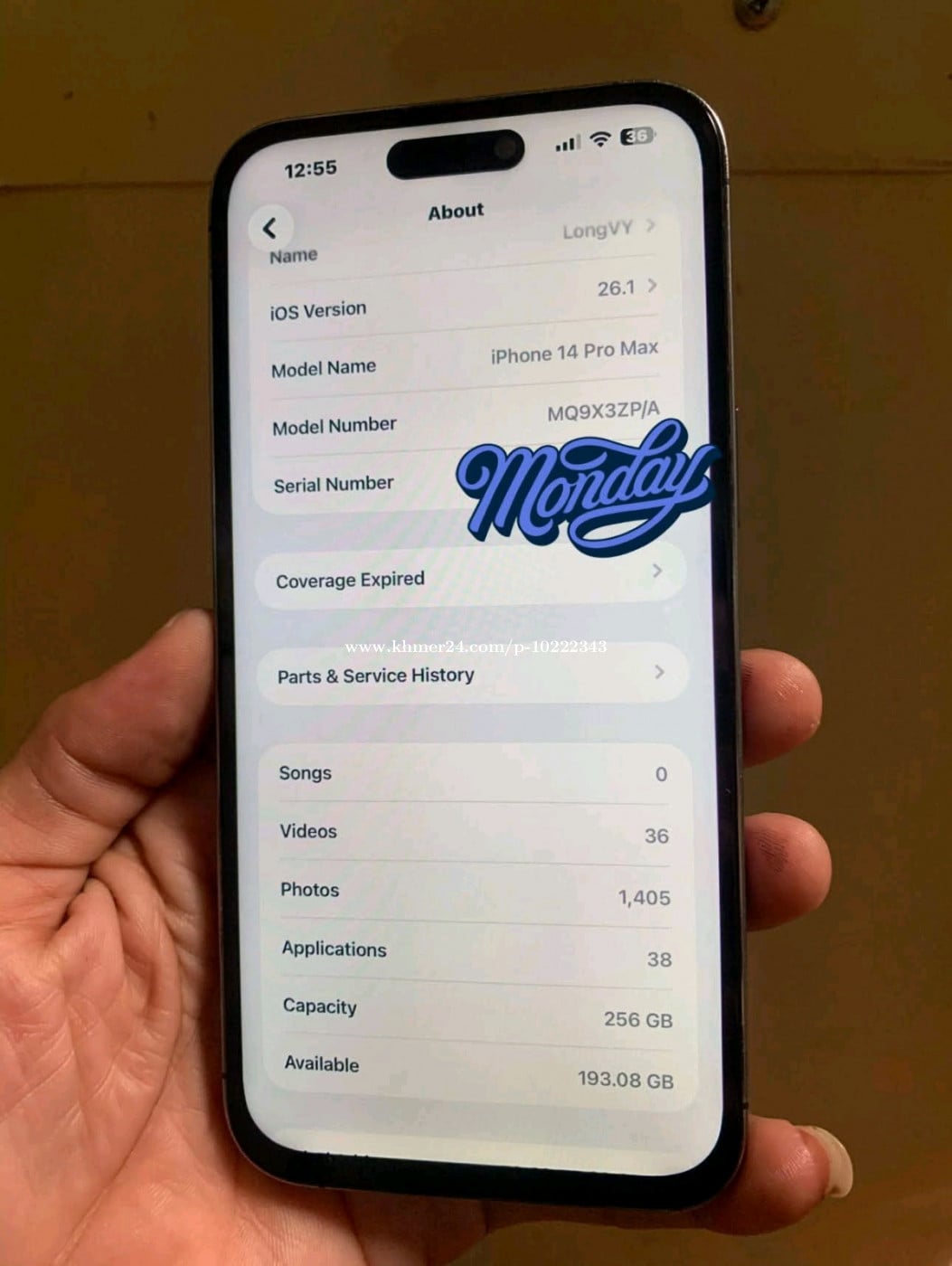 iPhone 14 Pro Max ZP 256g ម៉ាស៊ីនហ្ស៊ីនមានស្គេនថ្មដូរហើយ(ថ្មចាស់នៅ)អេក្រង់ថ្មីតួរឆ្អារលក់365$
