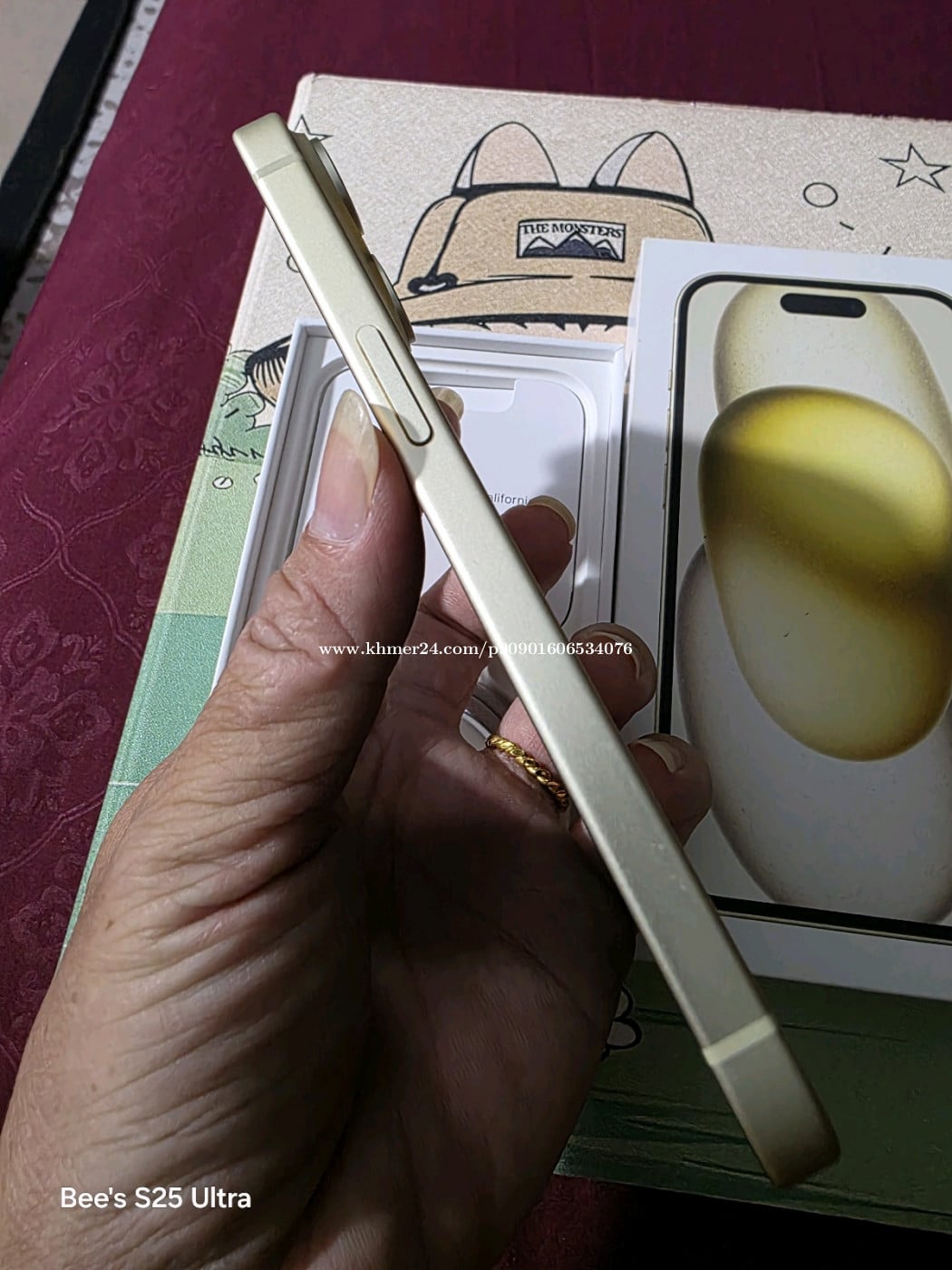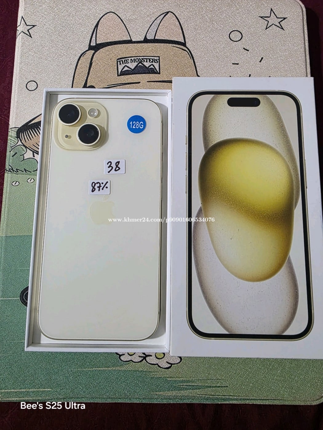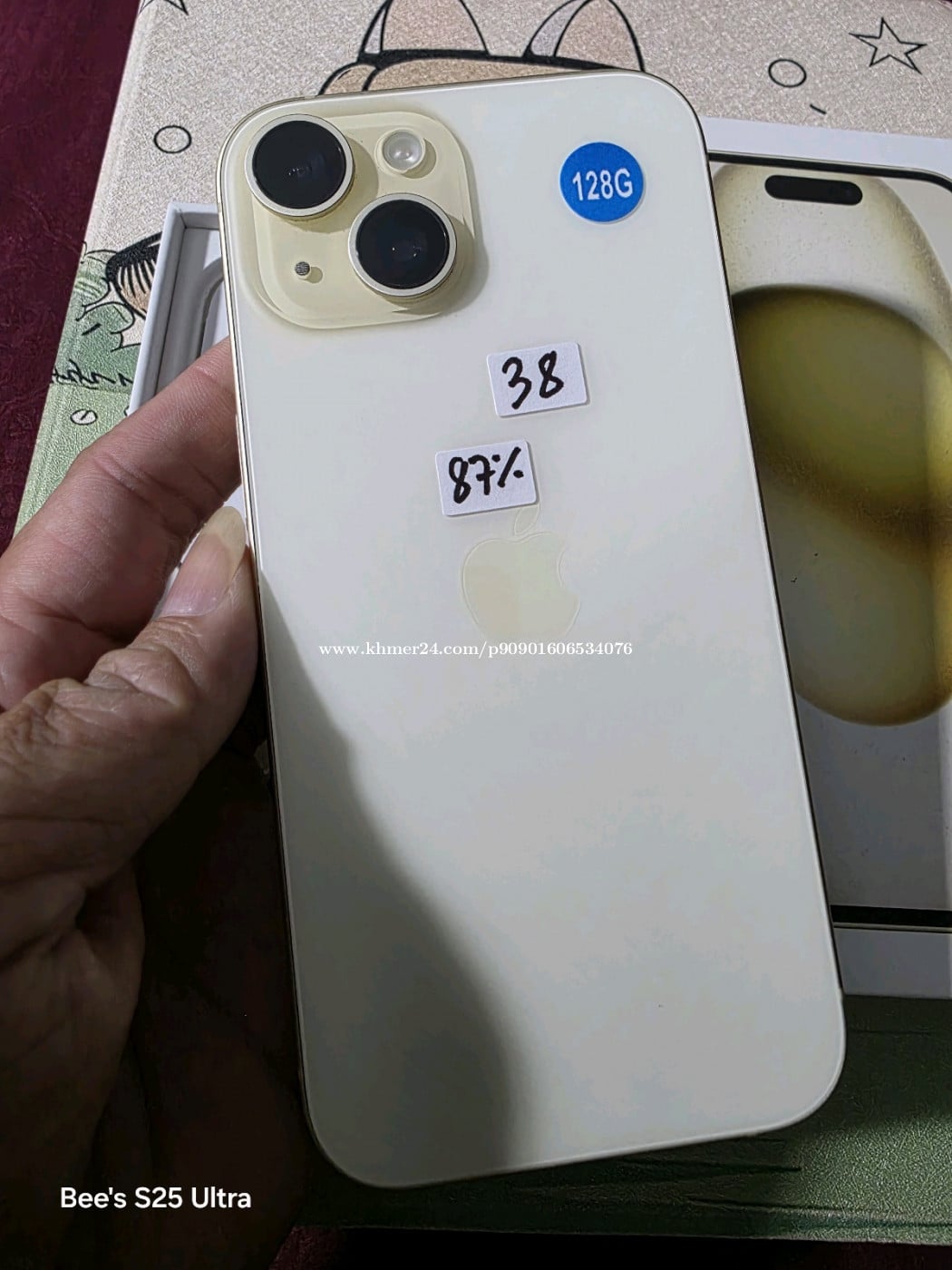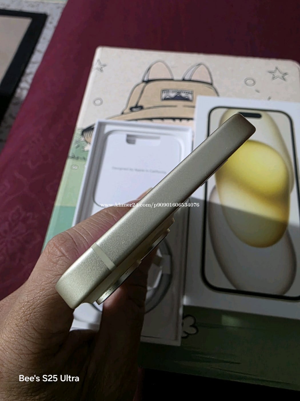 iPhone 15 128g ពណ៍លឿង សំនុំណែនស្អាត Sim1+Esim ថ្មស៊ីន 87% Full Set លក់ 495$ Tel: 093989xxxClick To Call