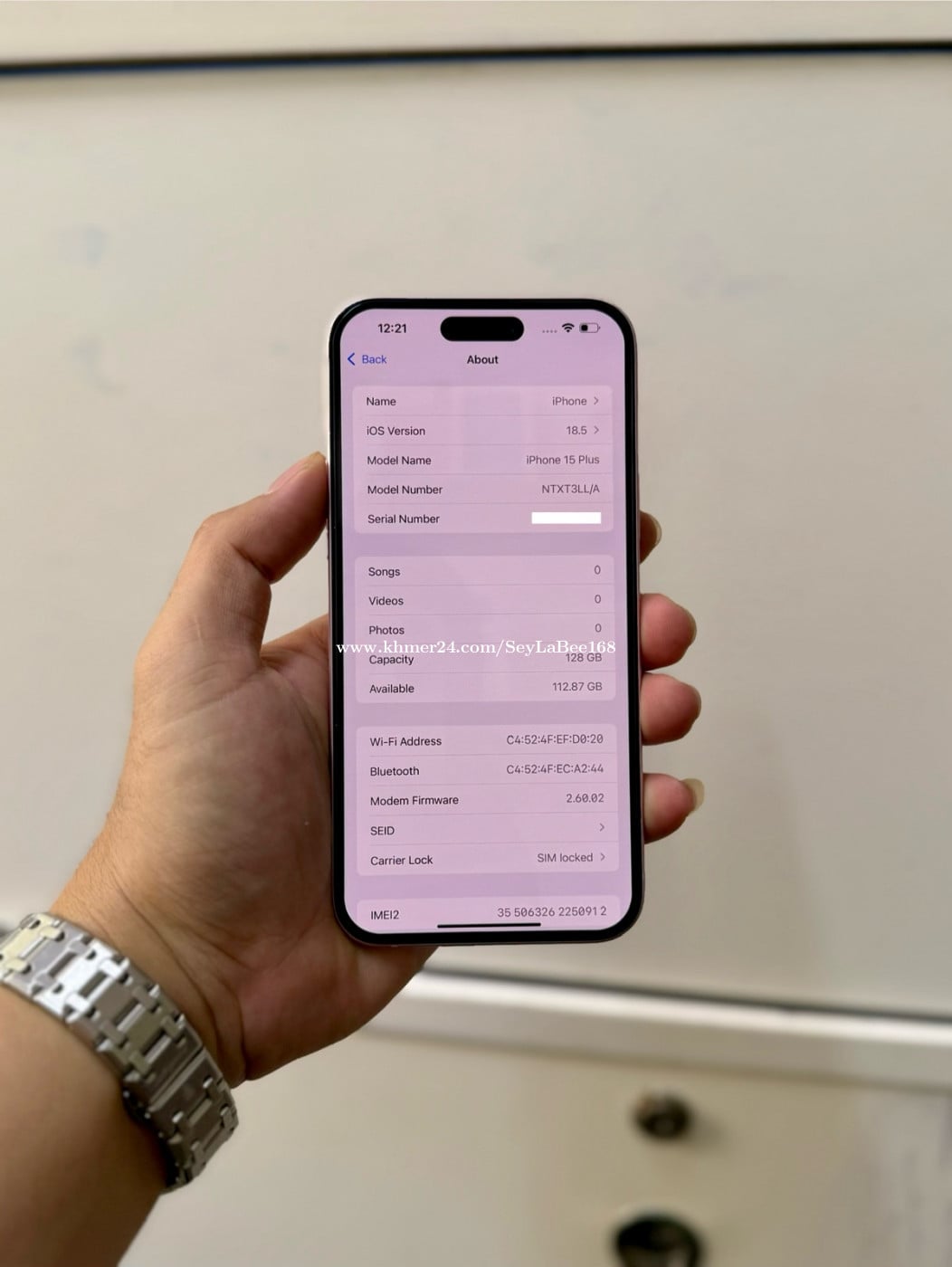 iPhone 15 Plus 128G Color Pink មួយទឹក lock simមិនបាច់ទ្រាប់ទ្រនាប់ស៊ីម ដាក់ស៊ីមប្រើយកម៉ង ( សុីម2 ) Free Case, Screen, ឆ្នាំងសាក,លែន អ្វីដែលអ្នកឃើញគឺជាអ្វីដែលអ្នកទទួលបាន អីវ៉ាន់នៅក្នុងរូបយ៉ាងម៉េច នៅក្រៅគឺយ៉ាងនោះ។ ធានាលើ ថាច់ និងម៉ាស៊ីន 1ខែ ទីតាំង ទឹកល្អក់៣ ទួលគោក ភ្នំពេញ Tell:086908xxxClick To Call Telegram Tell:0888708xxxClick To Call Telegram: https://t.me/SeyLa_Bee Channel: https://t.me/iPhoneBSL