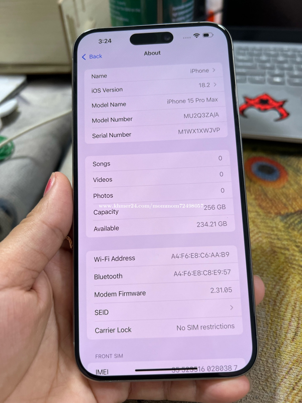 iPhone 15 pro max 256G សុំណុំហ្សីនណែន ស្អាត99% លក់790$ ទីតាំងបឹងសាឡាង ជិតស្នុកឃ័រ888 070419xxxClick To Call