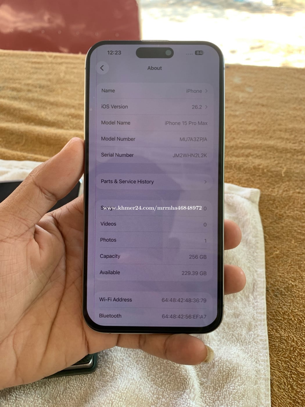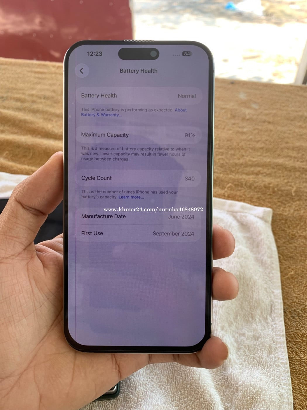 IPhone 15 Pro Max/256GB/Code ZP/A SIM2 ✅តម្លៃ=370$ដាច់ ✅បញ្ជាក់ អេក្រង់GXមានឆ្នូតតូចមួយនៅកៀនអេក្រង់ដូចរូប ដូរcamera ថ្មហ្សុីន91%ទេីបសាក់បាន340ដង ការប្រើប្រាស់បានល្អធម្មតាទាំងអស់។ ✅ធានាលេីម៉ាស៊ីនរយៈពេល15ថ្ងៃ ✅ទិញដាច់វៃដូរក៏បាន 📱016441xxxClick To Call 078779xxxClick To Call 0974066xxxClick To Call ទីតាំងនៅកំបូល
