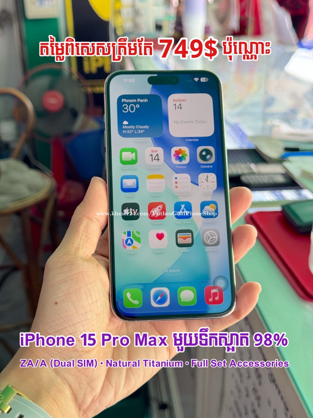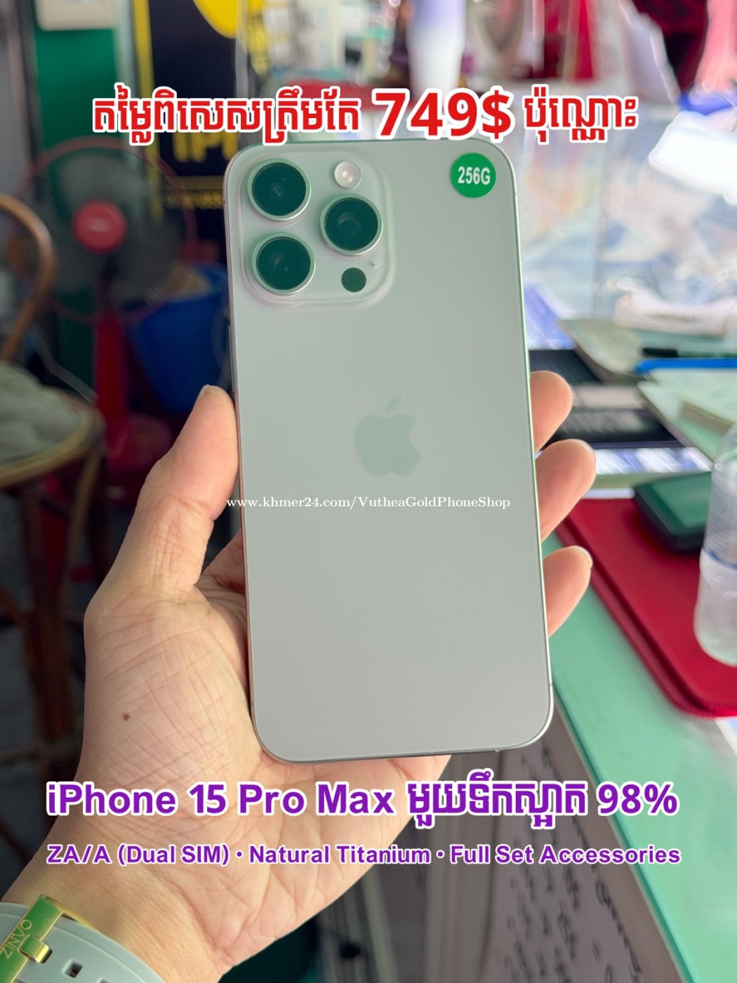 មួយគ្រឿងនេះតម្លៃធូរថ្លៃជាងទីផ្សារច្រើនគួរសម្យ ✔️ iPhone 15 Pro Max ZA/A (Dual SIM) 256GB 98% • Natural Titanium• Full Set Accessories • លក់ជូនតម្លៃត្រឹមតែ 749$ ប៉ុណ្ណោះ *តួមានស្នាមតិចតួចមិនបានថ្មីលះតែម៉ាល្មមសមរម្យប្រើ 🩶 💬 Telegram Chat: https://t.me/vutheagoldphoneshop