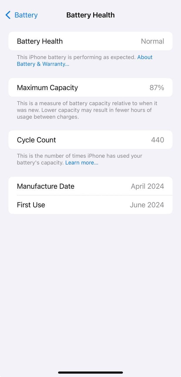 I want to sell my iPhone 15 pro max Natural color 256g with cable condition 98% battery 87% All parts Original.