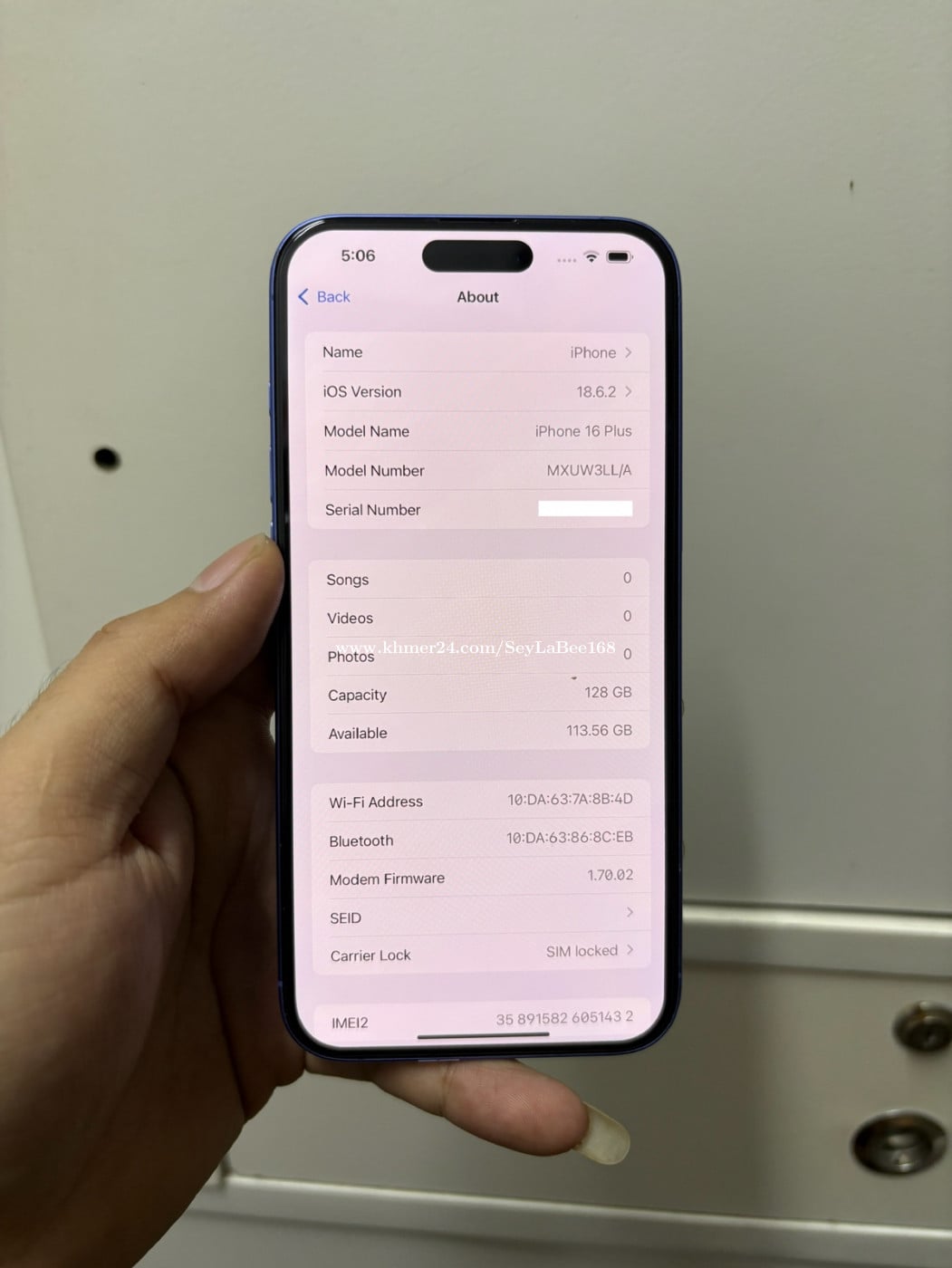iPhone 16 Plus មួយទឹក 128G lock simប៉ុន្តែមិនបាច់ទ្រាប់ទ្រនាប់ដាក់សុីមប្រើតែម្ដង (ប្រើបានសុីម2) Free Case, Screen, ឆ្នាំងសាក,លែន អ្វីដែលអ្នកឃើញគឺជាអ្វីដែលអ្នកទទួលបាន អីវ៉ាន់នៅក្នុងរូបយ៉ាងម៉េច នៅក្រៅគឺយ៉ាងនោះ។ 👉ធានាលើ ថាច់ និងម៉ាស៊ីន ១ខែ 📍ទីតាំង ទឹកល្អក់៣ ទួលគោក ភ្នំពេញ Tell:086908xxxClick To Call Telegram Tell:0888708xxxClick To Call Telegram: https://t.me/SeyLa_Bee Channel: https://t.me/iPhoneBSL