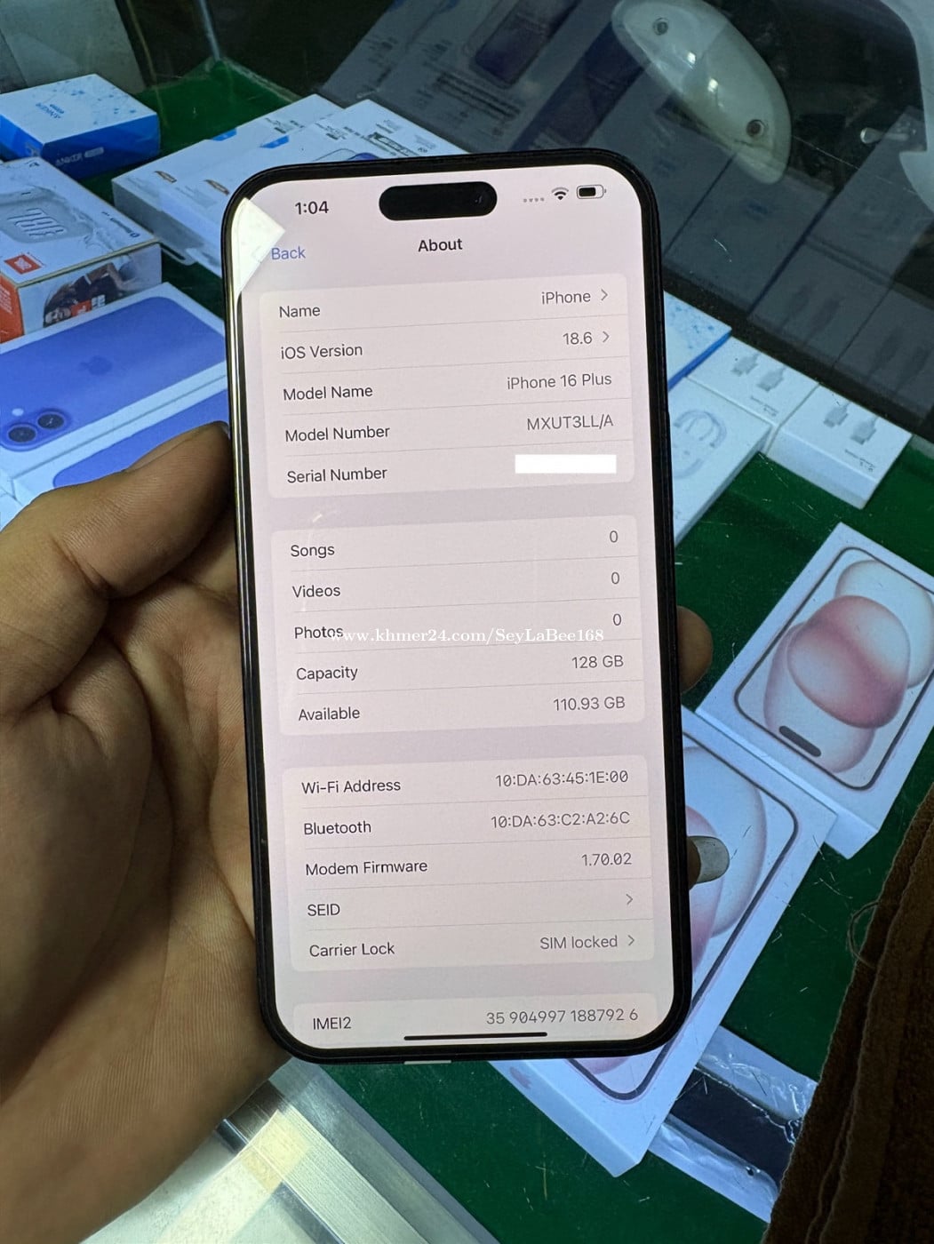 iPhone 16 Plus 128G មួយទឹក99% lock sim ប៉ុន្តែមិនបាច់ទ្រាប់ទ្រនាប់ស៊ីម ដាក់ស៊ីមប្រើយកម៉ង ( សុីម2 ) Free Case, Screen, ឆ្នាំងសាក អ្វីដែលអ្នកឃើញគឺជាអ្វីដែលអ្នកទទួលបាន អីវ៉ាន់នៅក្នុងរូបយ៉ាងម៉េច នៅក្រៅគឺយ៉ាងនោះ។ ធានាលើ ថាច់ និងម៉ាស៊ីន 15ថ្ងៃ ទីតាំង ទឹកល្អក់៣ ទួលគោក ភ្នំពេញ Tell:086908xxxClick To Call Telegram Tell:0888708xxxClick To Call Telegram: https://t.me/SeyLa_Bee Channel: https://t.me/iPhoneBSL