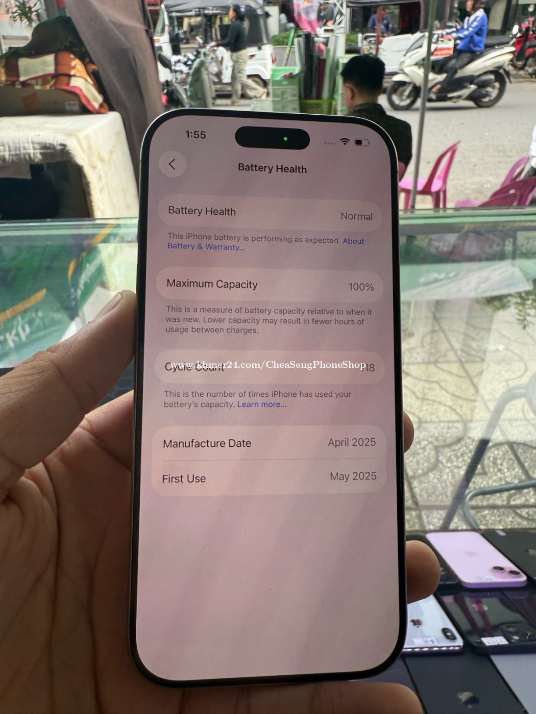 Have warranty in cambodia 1 year Battery 100% Natural Color Sim 1 + ESIM