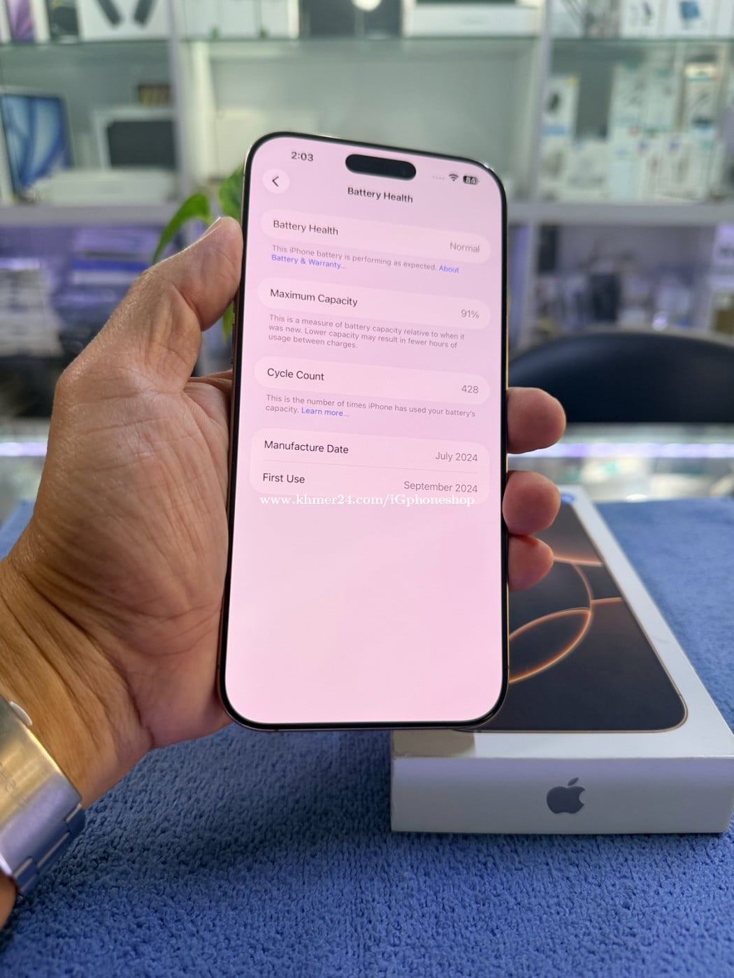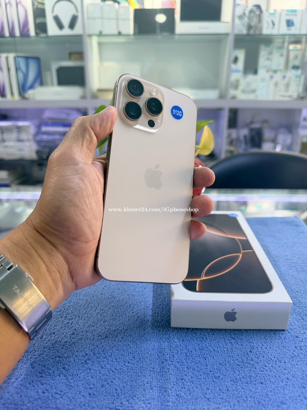 iPhone 16 Pro Max 512GB Color: Desert Titanium Model: ZA SIM 2 Condition: Good used battery: 91% Price: 1095$. Free screen, case, cable + Box Can loan with Aeon Call: 017565xxxClick To Call. 087770xxxClick To Call. Chat to Admin: https://t.me/sivhuyou Telegram: https://t.me/iGphoneshop