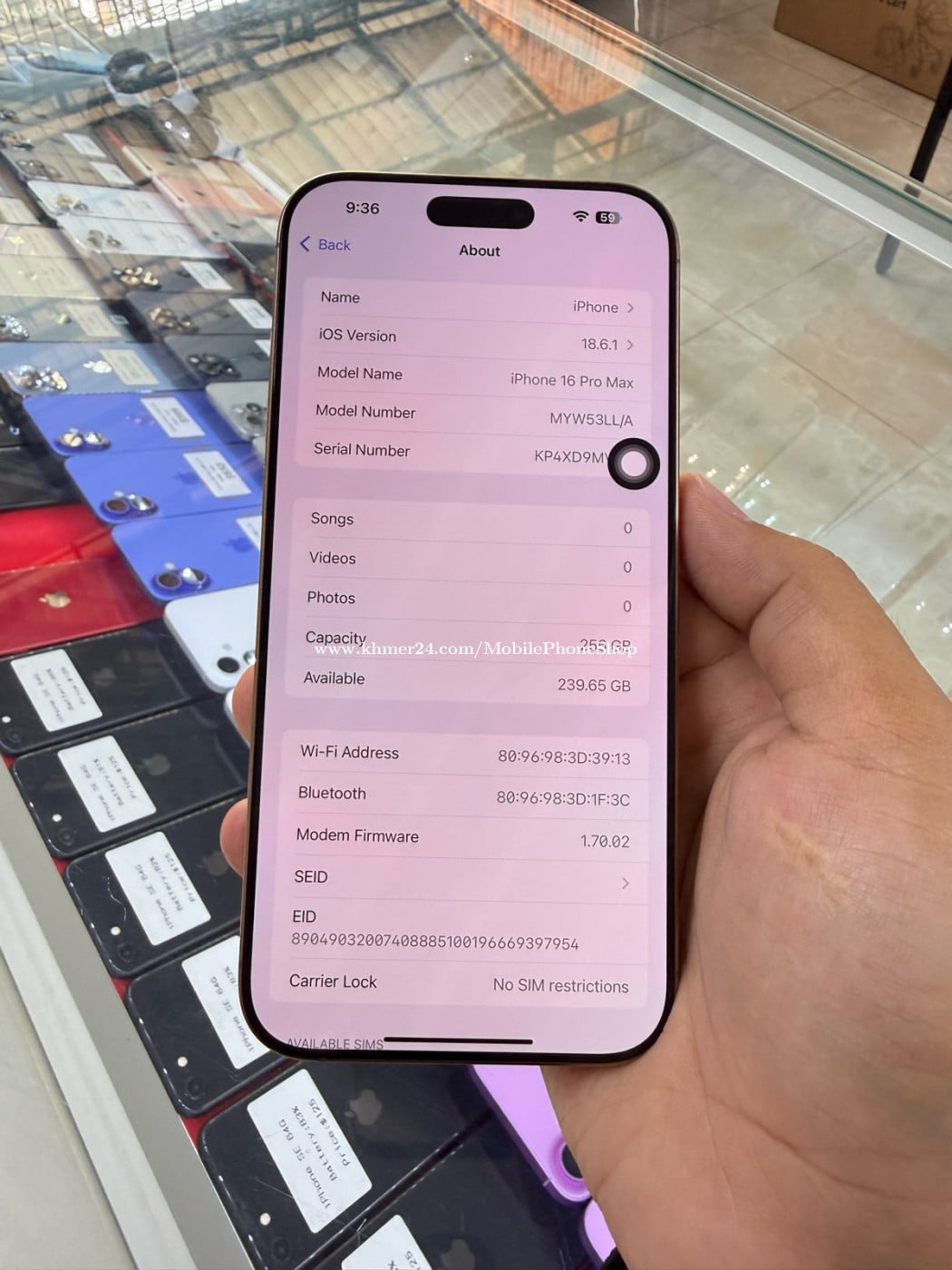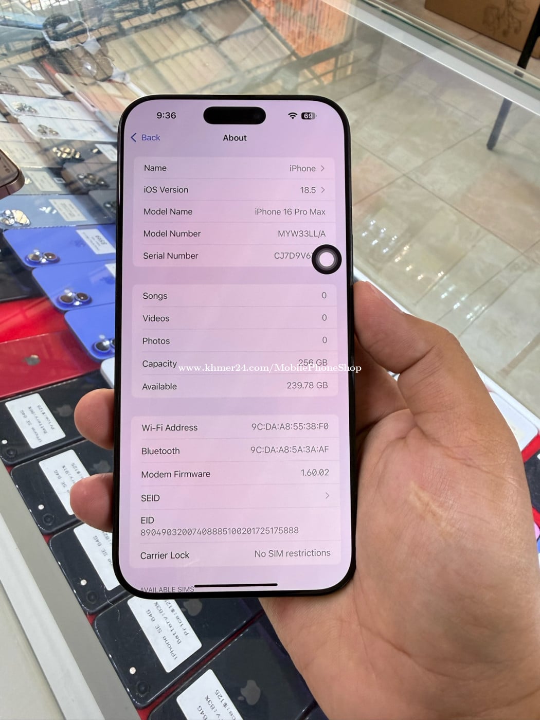 iPhone 16 Pro Max 256G LL/A Esim2 មួយទឹកសំនុំហ្ស៊ីន តម្លៃ: $850 (តម្លៃមិនចចារ) Free: ឆ្នាំងសាកហ្សីន, ស្រ្គិន & ខេស(ធានា1សប្ដាហ៍) ទីតាំង: ផ្លូវ160 , ស្តុបទេពផន , ភ្នំពេញ 📲Tel: 098200xxxClick To Call 📍Maps: https://maps.app.goo.gl/8YoH7dAZ6D2egm9v7?g_st=ic