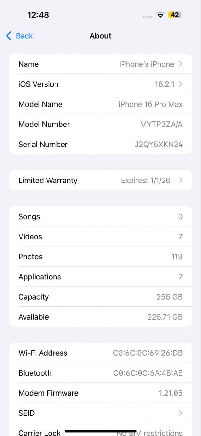 iPhone 16 Pro Max ZA 256GB 99.99% Cycle count 38 ដង