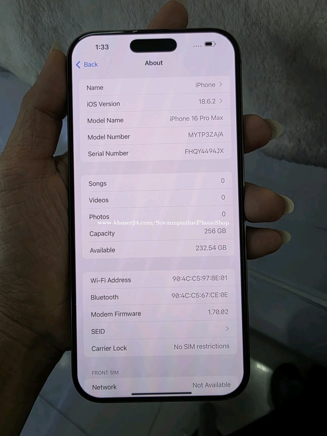 iPhone 16pro max 256G ZA sim2 ថ្ម94% ស្អាត98% ស្ទេីរតួតិចដូចក្នុងរូប ក្រៅពីនឹងថ្លឹង ធានាហ្សីនសុំនុំបេីមិនពិតលុយវិញ internetលឿន លេងអត់ក្តៅ បងប្អូនណាចាប់អារម្មណ៍មាននៅហាងពេជ្រសុវណ្ណពន្លឺ នឹងហាងសុវណ្ណឧត្តម tel: 081335xxxClick To Call/ 017553xxxClick To Call