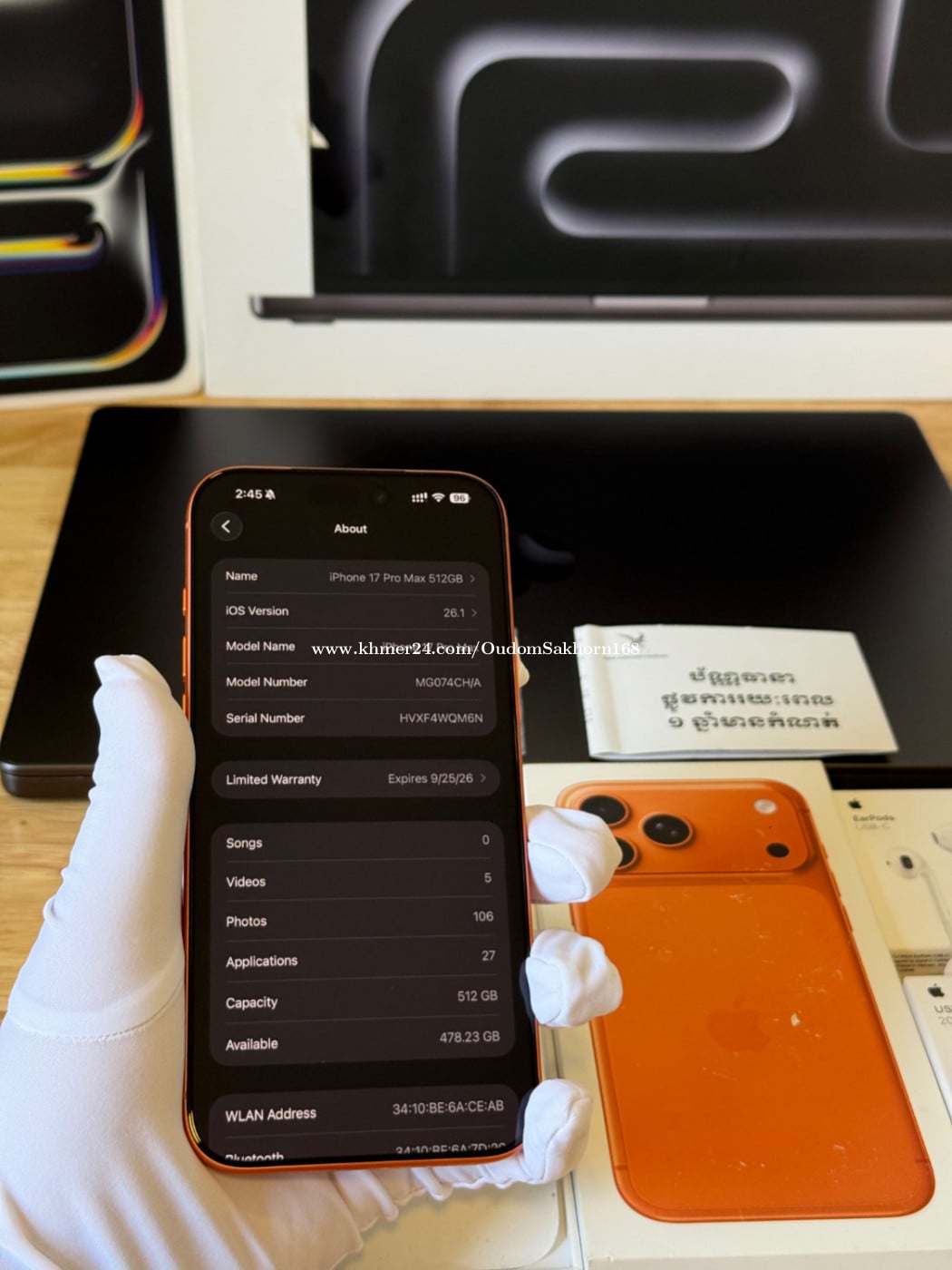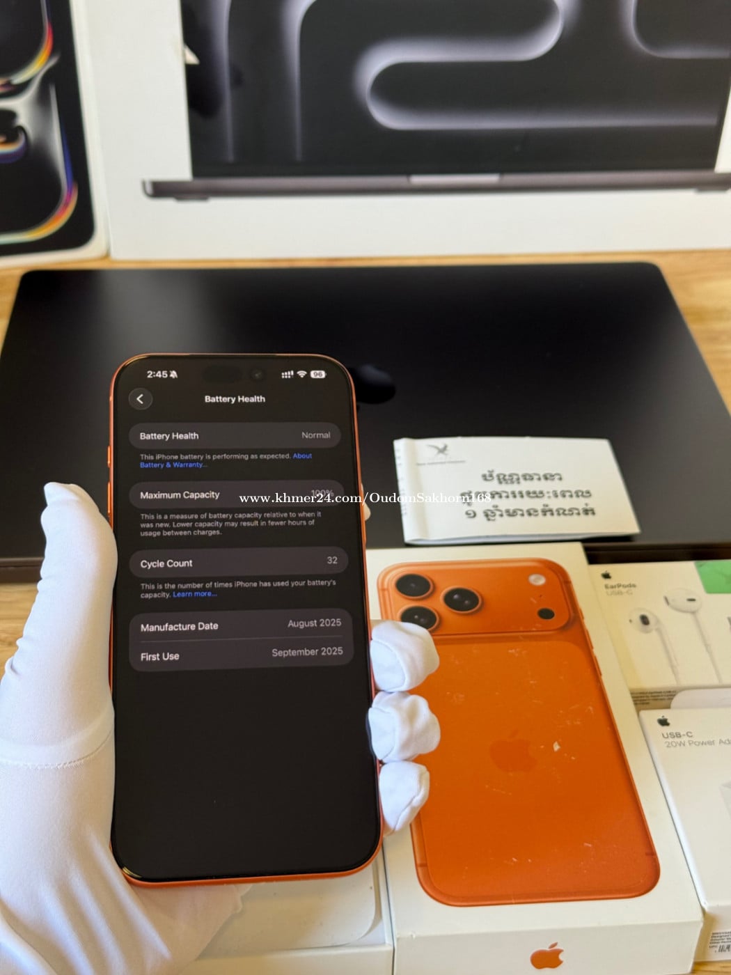 iPhone 17 Pro Max 512GB Cosmic Orage, SIM 2 Model Code: CH ជា Model តែមួយគត់ក្នុងពេលឥលូវនេះដែលអាចប្រើប្រាស់សុីមកាតបាន 2 ក្រៅពីនេះ Model ZP, ZA, XA អាចប្រើសុីមកាតបាន 1 និង eSIM ហើយ Model LL ប្រើប្រាស់បានតែ eSIM ប៉ុណ្ណោះ កាលទិញថ្មីតម្លៃ $1999 ឥលូវលក់វិញតែ $1599 ប៉ុណ្ណោះ មានស្នាមបន្តិច ក្រៅពីហ្នឹងនៅស្អាតដូចថ្មី Cycle Counts: 32 Battery Health: 100% មានទទួលទិញ លក់ និង វៃដូរ MacBook, iPhone, iPad , AirPods, Apple Pencil និង Apple Watch ក្នុងតម្លៃខ្ពស់ជាងទីផ្សារ Tel: 069770xxxClick To Call / 017776xxxClick To Call Telegram: https://t.me/SakhornOudom