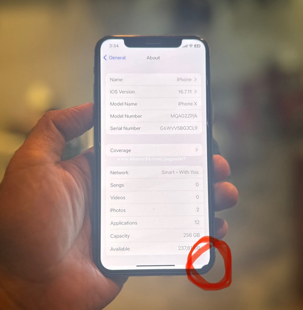 iPhone X 256g Zp តួស្អាត អេក្រង់ខ្មៅបន្តិចនៅខាងក្រោមដូចក្នុងរូប ដូរថ្មរូច ម៉ាស៉ីនសុីន មិនធ្លាប់ជួសជុល
