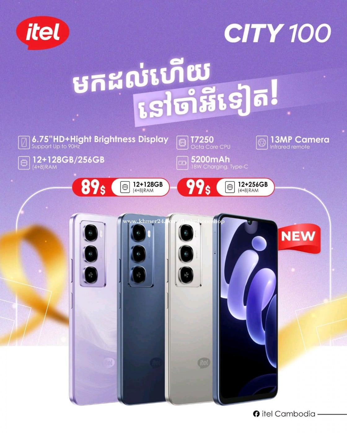 "#city100 Model ថ្មី មានរូបរាងស្អាត ទាក់ទាញ ទាន់សម័យ :: អេក្រង់ទំហំ 6.75” ប្រភេទ HD+Hight Brightness Display ដែលមាន refresh rate លឿន90hz និងមើល Smooth ល្អ :: កាមេរ៉ាខាងក្រោយមាន ទំហំ 13MP ហើយកាមេរ៉ាមុខទំហំ 8MP :: ថាមពល ថ្មក្នុងទូរស័ព្ទមានទំហំ 5200mAh 18W Type-C ប្រើបានយូរ :: លឿន ម៉ាស៊ីននេះមាន Ram 4GB បូកបន្ថែម 8GB និងមេមូរីក៏ធំដល់ទៅ 256GB :: Ram (4+8) 12+128GB=89$ :: Ram (4+8) 12+256GB=99$