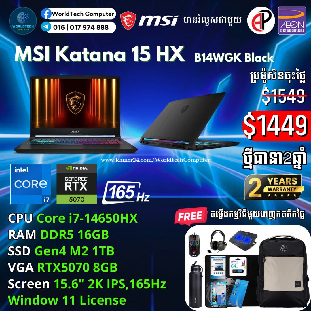 Katana15HX i7-14650HX 16G M2 1TB RTX5070 8G 15.6" 2K 165Hz New=1449$ Katana17HX i7-14650HX 16G M2 1TB RTX5050 8G 17.3" 2.5K 240Hz New=1269$ Katana17HX i7-14650HX 16G M2 1TB RTX5060 8G 17.3" 2.5K 240Hz New=1399$ Katana17HX i7-14650HX 16G M2 1TB RTX5070 8G 17.3" 2.5K 240Hz New=1549$ Telegram: 017974xxxClick To Call , 011777xxxClick To Call ទីតាំងហាង: ផ្ទះ39Eo ផ្លូវ257 ទឹកល្អក់3 ទួលគោក ភ្នំពេញ (ខាងលិចស្តុបទេពផនប្រហែល 300ម)។ Location: #39E0 St257, Tuol Kouk , Tuek L'ak Bei , Phnom Penh