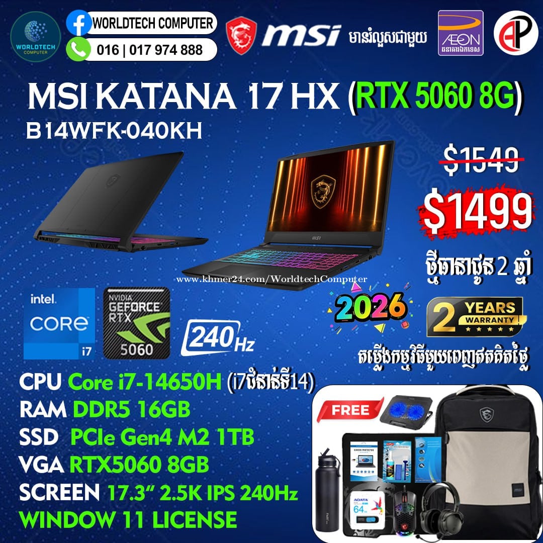 Katana17HX i7-14650HX 16G M2 1TB RTX5050 8G 17.3" 2.5K 240Hz New=1359$ Katana17HX i7-14650HX 16G M2 1TB RTX5060 8G 17.3" 2.5K 240Hz New=1499$ Katana17HX i7-14650HX 16G M2 1TB RTX5070 8G 17.3" 2.5K 240Hz New=1599$ ថ្មីកេស ធានា២ឆ្នាំ ពី MSI Cambodia Telegram: 017974xxxClick To Call , 011777xxxClick To Call ទីតាំងហាង: ផ្ទះ39Eo ផ្លូវ257 ទឹកល្អក់3 ទួលគោក ភ្នំពេញ (ខាងលិចស្តុបទេពផនប្រហែល 300ម)។ Location: #39E0 St257, Tuol Kouk , Tuek L'ak Bei , Phnom Penh