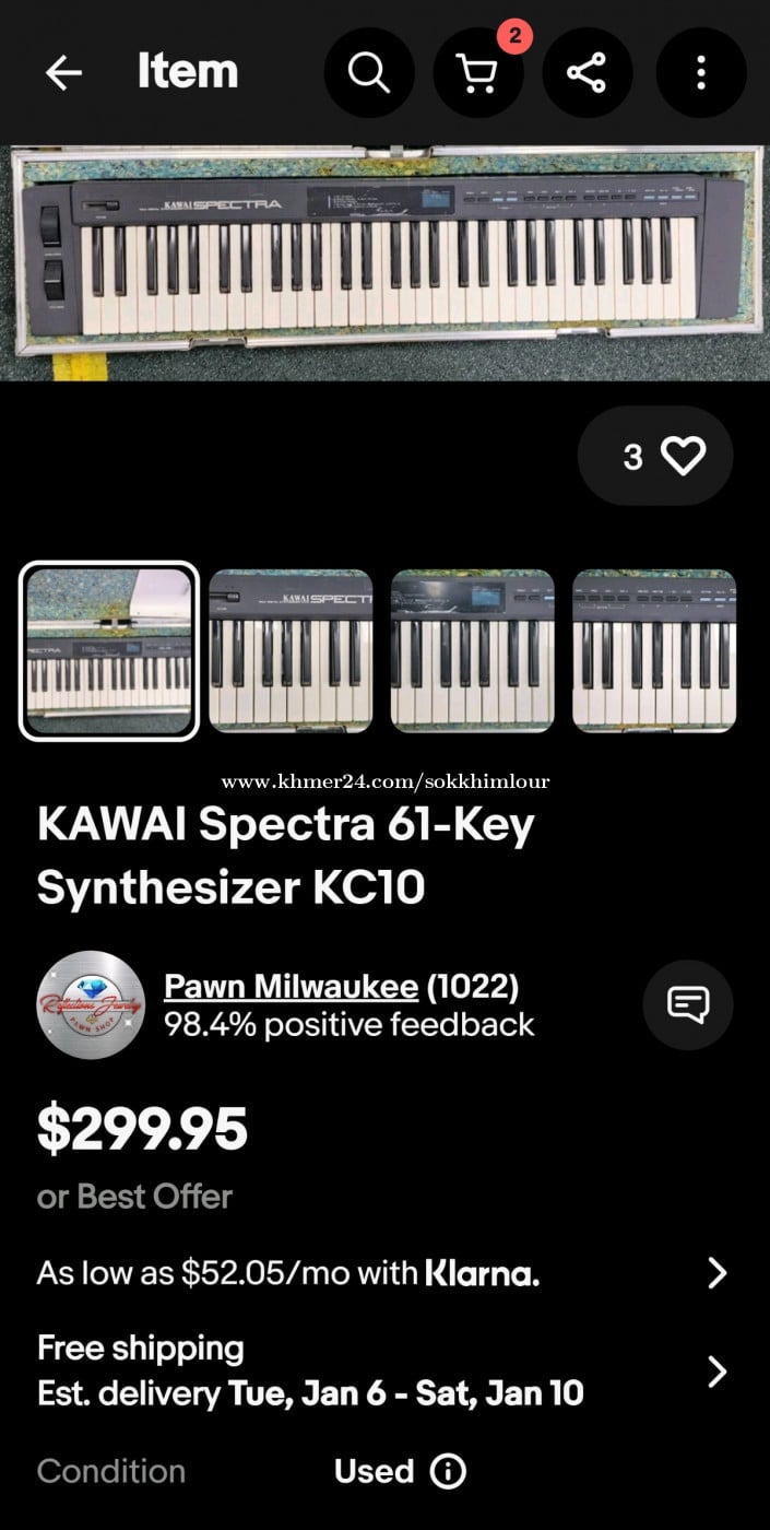 Working great Please DM for more details video Free delivery in Phnom Penh Free adapter $130 This is a Kawai Spectra KC10 digital synthesizer. It is a 61-key, velocity-sensitive keyboard. The synthesizer is 10-voice multitimbral and uses 16-bit PCM and DC waveforms. Key features include a built-in rhythm section with 36 patterns, an arpeggiator, and MIDI capabilities. It does not have internal speakers and requires headphones or an external amplifier for sound output.