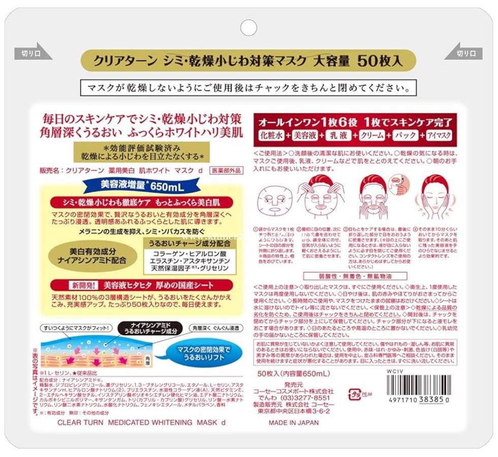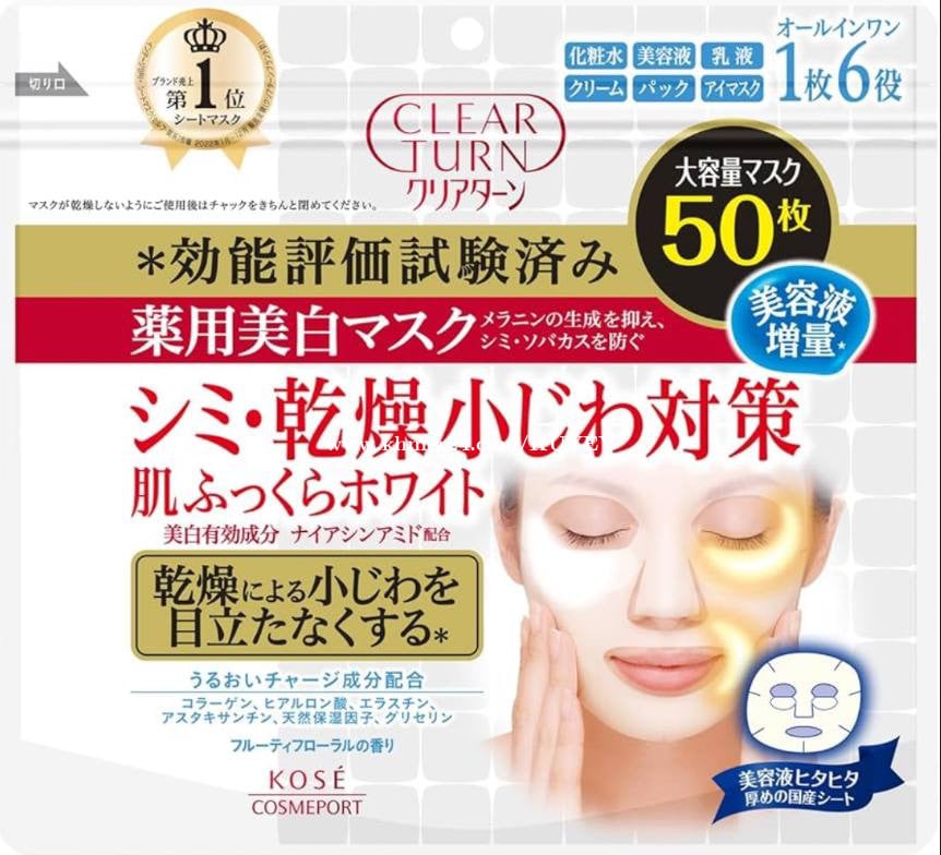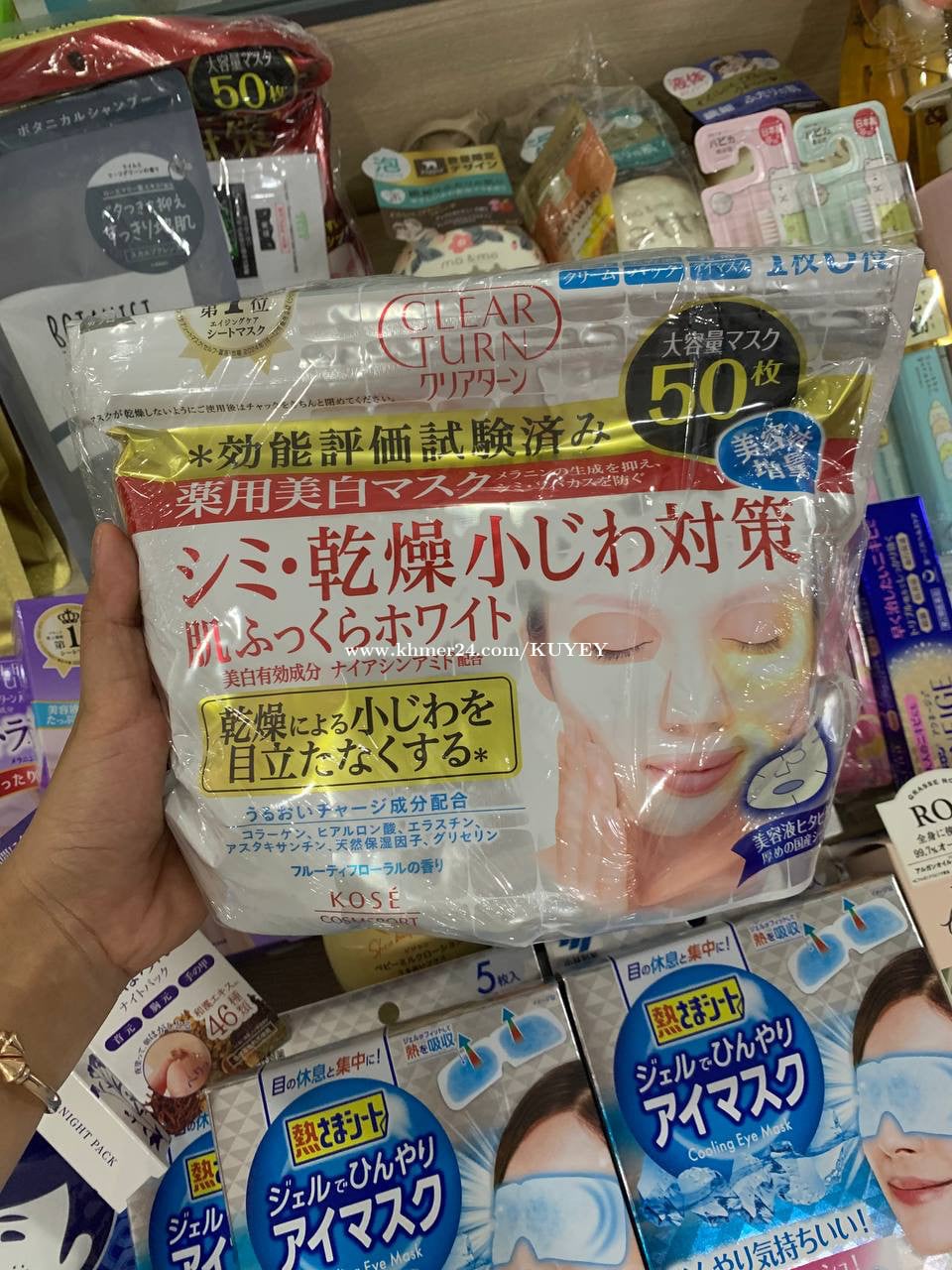 ✨❤️ម៉ាសបិទមុខ KOSE Clear Turn White Mask 6-in-1 ដែលមានសមត្ថភាពខ្ពស់ ដែលមាន Niacinamide, collagen និង hyaluronic acid។ វាដើរតួជាlotion, serum, milk, eye mask, cream, and mask ដែលល្បីនៅប្រទេសជប៉ុន 🇯🇵❤️ គឺជាម៉ាសបិតមុខដែលផ្តោតសំខាន់ទៅលើអ្នកដែលមានបញ្ហាស្បែកមុខមុនខ្មៅ ស្នាមអាចម៍រុយ ស្នាមជ្រៀវជ្រួញតិចតួចនៅតំបន់ក្រោមភ្នែក នឹងsmile lines ជួយធ្វើឲមុខស និងស្បែកខ្មៅស្រអាប់ផងដែរ។😊 👉🏻មុខងារសំខាន់ៗរបស់ម៉ាសនេះគឺ ផ្តោតសំខាន់ជួយធ្វើឲស្បែកស សំណើមដល់ស្បែក✨ 👉🏻បំបាត់ស្នាមមុន ជាំ អុចខ្មៅ✨ 👉🏻ធ្វើឲស្បែកភ្លើរលោង និងជួយកាត់កាត់បន្ថយស្នាមជ្រួញនៅតំបន់ក្រោមភ្នែក នឹងsmile lines✨ ការណែនាំអំពីការប្រើប្រាស់: លាងមុខឲស្អាត បន្ទាប់ពីលាងសម្អាតរួច សូមបិតម៉ាសរួចបិទទុករយៈពេល ១០-១៥ នាទី។ មិនចាំបាច់លាងសម្អាតទេ។ អាចប្រេីប្រាស់បានជារៀងរាល់ថ្ងៃ។🇯🇵❤️ មួយកញ្ចប់មាន50សន្លឹក។💋❤️⭐️