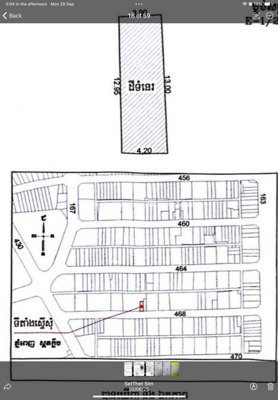 ទីតាំង៖ ផ្លូវលេខ ៤៦៨ ភូមិ ១ សង្កាត់ទួលទំពួងទី ២ ខណ្ឌចំការមន រាជធានីភ្នំពេញ (ជិតភ្នំពេញស្ពតក្លឹប និង Tan Tower) ផែនទី៖ https://maps.app.goo.gl/g8KJbYoCEA47cVfr6 តម្លៃ ជួល៖ ៤៥0$/ខែ លក់៖ ១៤៥,០០០$ បញ្ជាក់៖ ដីប្លង់រឹងមិនមានសំណង់, មានលិខិតសាងសង់ជញ្ជាំងរួម Location: Street No. 468, Village 1, Toul Tompoung 2 Sangkat, Chamkarmon District, Phnom Penh (Near Phnom Penh Sport Club and Tan Tower) Map: https://maps.app.goo.gl/g8KJbYoCEA47cVfr6 Price Rent: $450/month Sale: $145,000 Note: The land has a hard title and no buildings