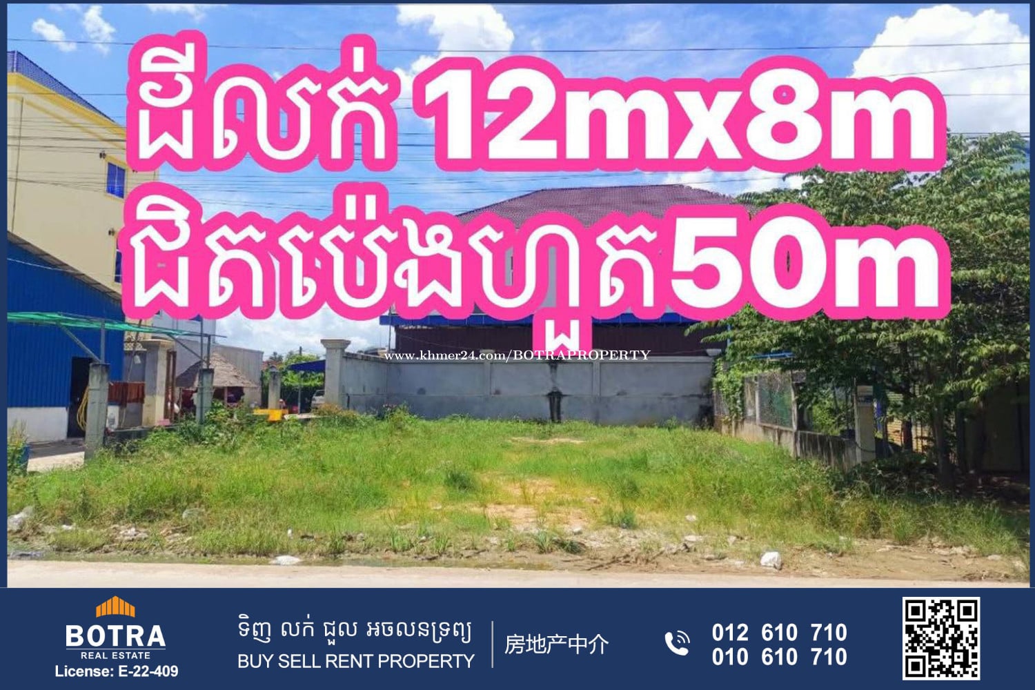 Land for sale, main concrete road, near Peng Huot Road 50m, Wat Prek Thleung #Aeon3 ๐Ÿ‘‰ Good for opening all kinds of businesses, township โ€ข Size: 92m2 (Frontage: 12m) โ€ข Negotiable price: $69,500 โ€ข Hard title L-Map โ€”โ€”โ€”โ€”โ€”โ€”โ€”โ€”โ€” Contact us now ๐Ÿ“ž 012610xxxClick To Call (Cellcard) ๐Ÿ“ž 010610xxxClick To Call (Smart) โ–ถ๏ธ t.me/BotraRealEstate (Chat)