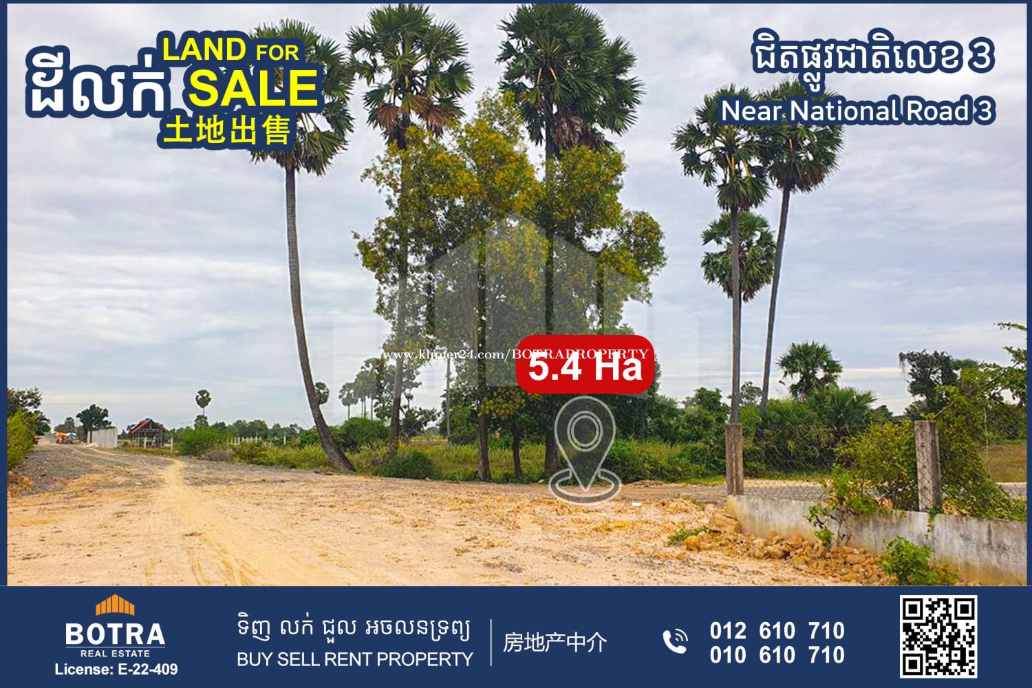 ๐ฃ Land for sale along 12m wide road, near National Road 3 #SS0565 โข Size: 54,795mยฒ (Frontage: 60m) โข Price: $25/mยฒ (negotiable) โข Hard title L-Map โโโโโโโโโ Contact us now ๐ 012610xxxClick To Call (Cellcard) ๐ 010610xxxClick To Call (Smart) โถ๏ธ t.me/BotraRealEstate (Chat)
