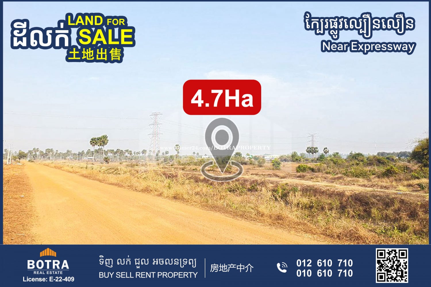 ๐ฃ Land For Sale along 40m wide Road, Near Expressway and National Road 4 #SS0015 โข Size: 47,460m2 (Frontage: 335m) โข Price: $35/m2 โข Hard title L-Map ๐ SamrongTong, Kampong Speu. โโโโโโโโโ Contact us now! ๐ 012610xxxClick To Call (Cellcard) ๐ 010610xxxClick To Call (Smart) โถ๏ธ t.me/BotraRealEstate (Chat)