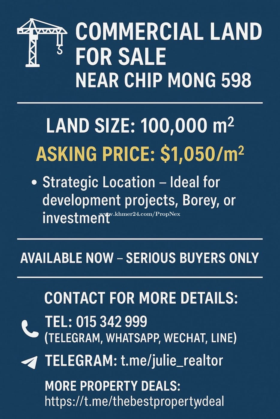 ๐๏ธ Commercial Land for Sale Near Chip Mong 598 ๐ Land Size: 100,000 mยฒ ๐ฐ Asking Price: $1,050/mยฒ ๐ Strategic Location โ Ideal for development projects, Borey construction, or long-term investment. ๐ Available Now โ Serious Buyers Only ๐ Contact for More Details: ๐ฒ Tel: 015342xxxClick To Call (Telegram, WhatsApp, WeChat, Line) ๐ฌ Telegram: t.me/julie_realtor ๐ More Property Deals: https://t.me/thebestpropertydeal