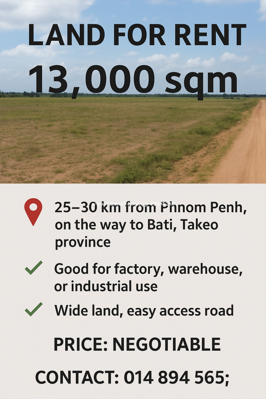 ដីជួល Land for Rent – 13,000 sqm 📍 Location: 25–30 km from Phnom Penh, on the way to Bati, Takeo province ✅ Good for factory, warehouse, or industrial use ✅ Wide land, easy access road 💰 Price: Negotiable 014894xxxClick To Call