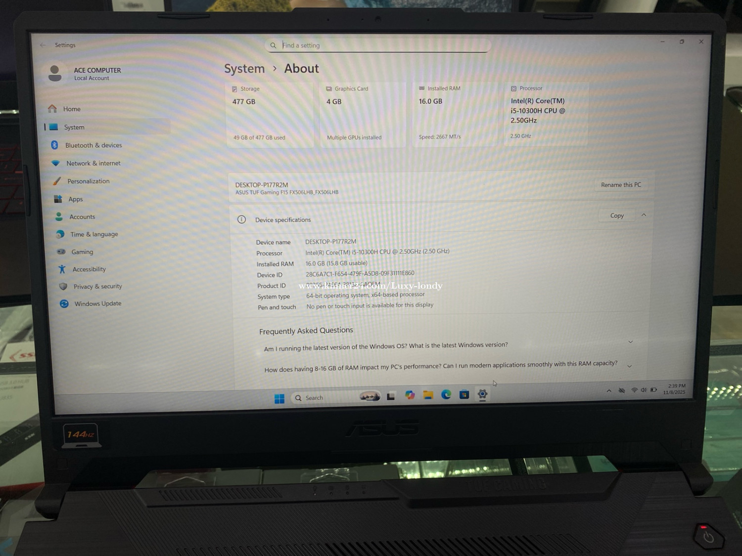 Asus Gaming Core i5-10th Ram 16G Room 512G VGA NVIDIA GTX 1660 Graphics Card 4GB