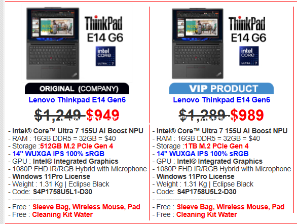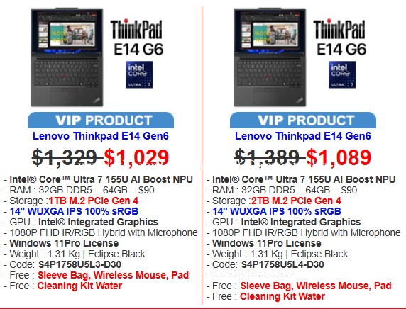 Lenovo Thinkpad E14 Gen6 $949 - Intelยฎ Coreโข Ultra 7 155U AI Boost NPU - RAM : 16GB DDR5 = 32GB = $40 - Storage :512GB M.2 PCIe Gen 4 - 14" WUXGA IPS 100% sRGB - GPU : Intelยฎ Integrated Graphics - 1080P FHD IR/RGB Hybrid with Microphone - Windows 11Pro License - Weight : 1.31 Kg | Eclipse Black - Code: S4P1758U5L1-D30 - -------------------------- - Free : Sleeve Bag, Wireless Mouse, Pad - Free : Cleaning Kit Water ๐๐๐ ๐๐จ๐ฆ๐ฉ๐ฎ๐ญ๐๐ซ (แแแแผแแแแแแปแแถแแแแแ) โ๏ธ แแแถแแแแแแ 0930957xxxClick To Call 77 ๐ฌ Telegram : t.me/cnkcomputer93 ๐ Website: https://cnkcomputer.com/